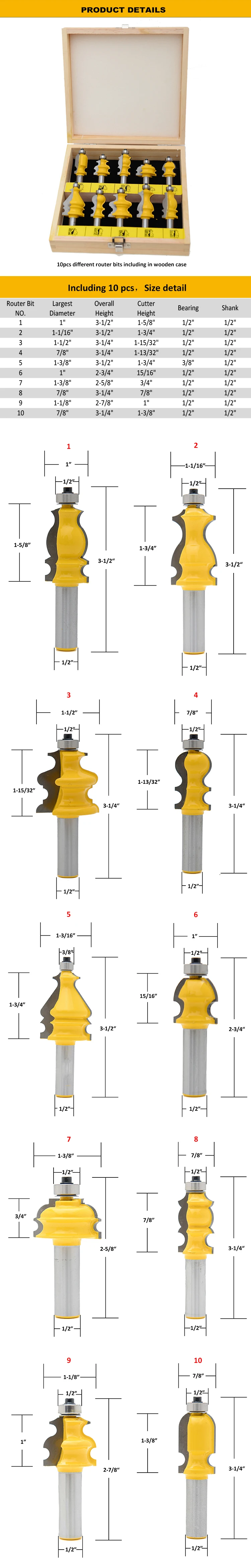 10pcs Router bits set woodworking router bits 1/2" shank wood box case packaging for Trimmer and engraving machine tools.