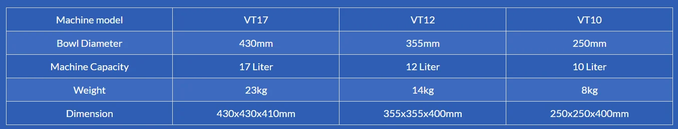 Model Number: VT12 Voltage: 220V. Capacity:6.2kg, Size: 355*355*400mm, Weight:14kg. Designed with heavy duty drive and suspension system,as well as additional adyustable amplitude and tough,cross-linked polyethylence for use with all medias to achieve aptimum processing results.Good for chains,bracelets and necklaces tumbling. 2800RPM