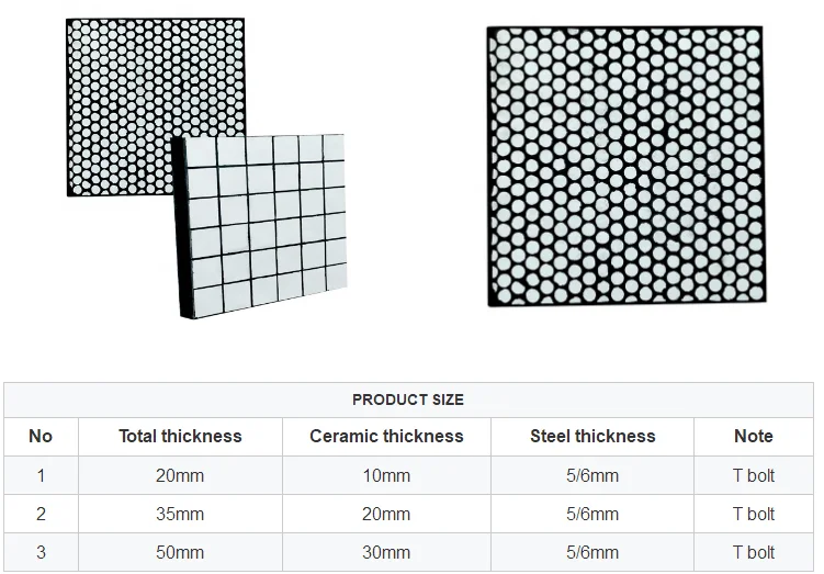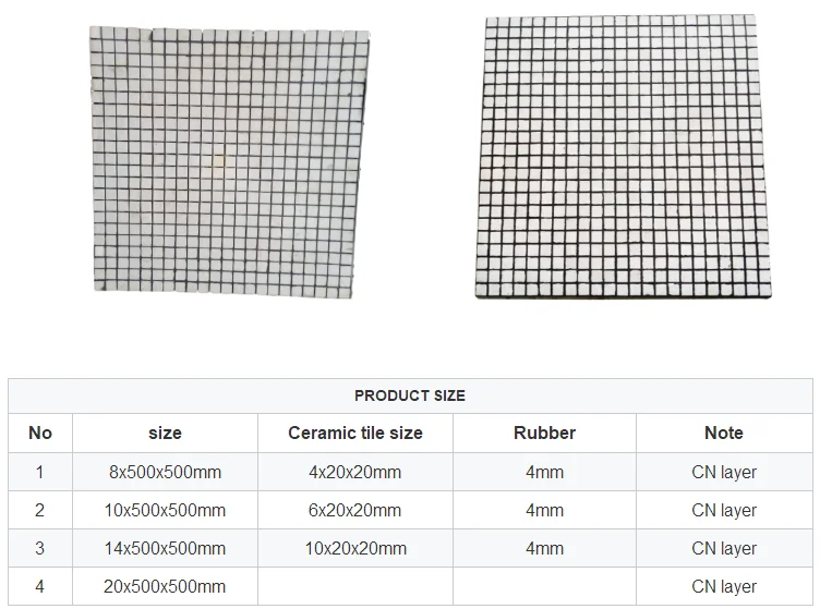 Ceramic wear liners are made of extremely hard ceramics that provide unsurpassed resistance to abrasive wear while the rubber effectively dampens the impact forces that can crack the ceramic rods. The resilient rubber matrix that surrounds the ceramic rods is hot vulcanized for superior adhesion. Ceramic rubber lining is mainly used in the mining and quarrying industries, where severe abrasion occurs and the angles of impact are low. i.g. conveyor chutes, bins, hoppers, etd.