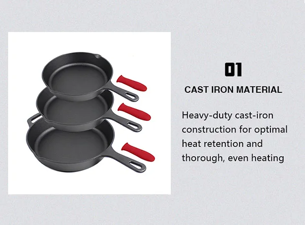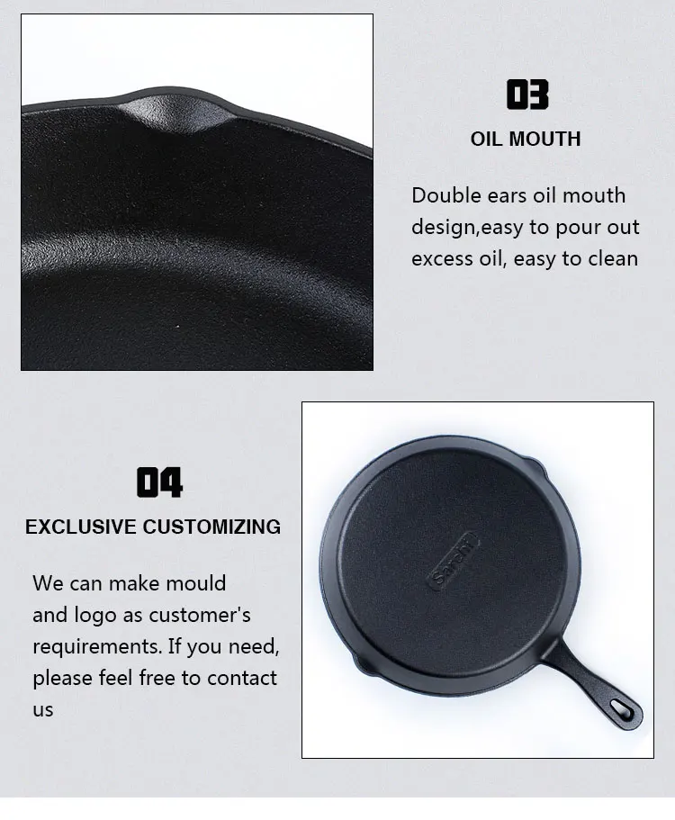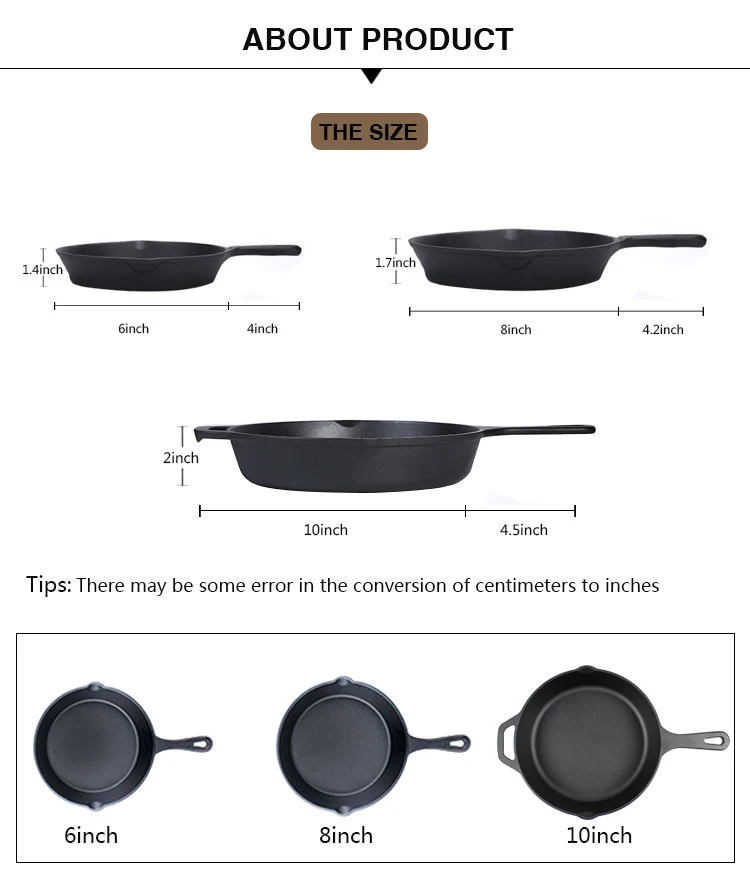 The 8'' 10'' 12'' cast iron skillet set is very cost-effective. It is a classic model among the cast iron frying pans. Its audience is very large, almost Suitable for all families, its entire design, including the size of the cast iron skillet, the help handles, the size of the handle and the price are all a cast iron frying pan that is very suitable.