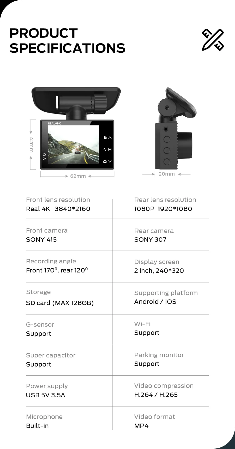 •OPTIONAL FEATURE: 64GB memory card Signal lens recording ( front 4K camera ONLY) |