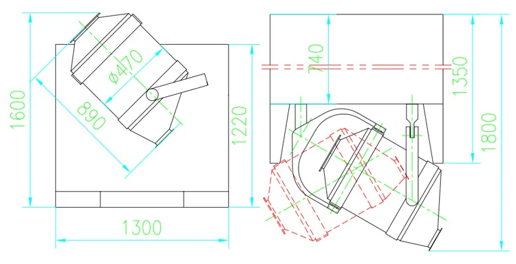 During running the mixing vat has a multidirectional operation that speeds up the flowing and diffusing of materials. It also avoids the gravity segregation and accumulation phenomenon of other general mixers caused by centrifugal action. Therefore, this machine has highly efficient mixing capabiolities.