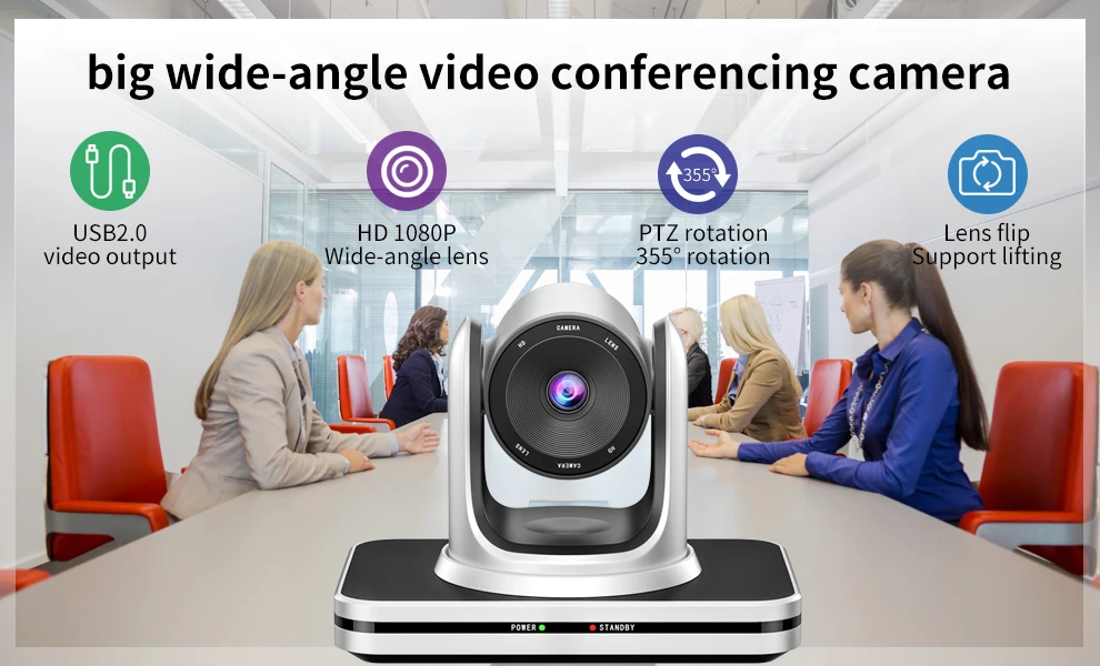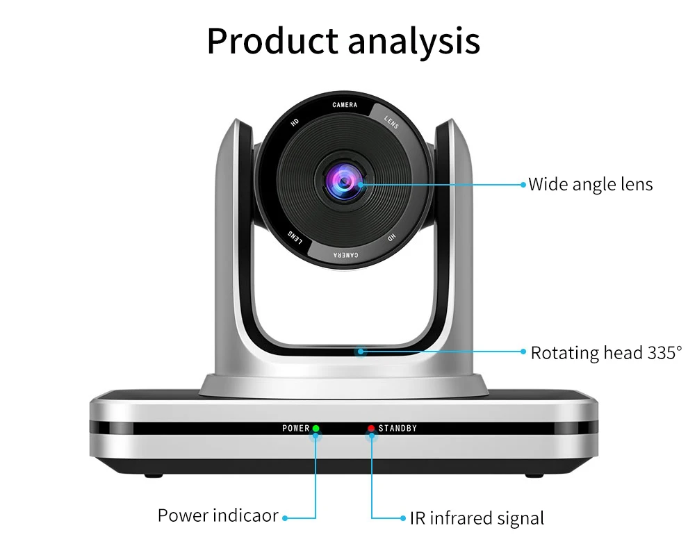 HD 1080P Fixed Focus Wide Angle HD Conference Camera | Pan:355°(max.speed:80°/s) Tilt:-30°to +90°(max.speed:60°/s) | RS-232, RS-485 IR remote contro |