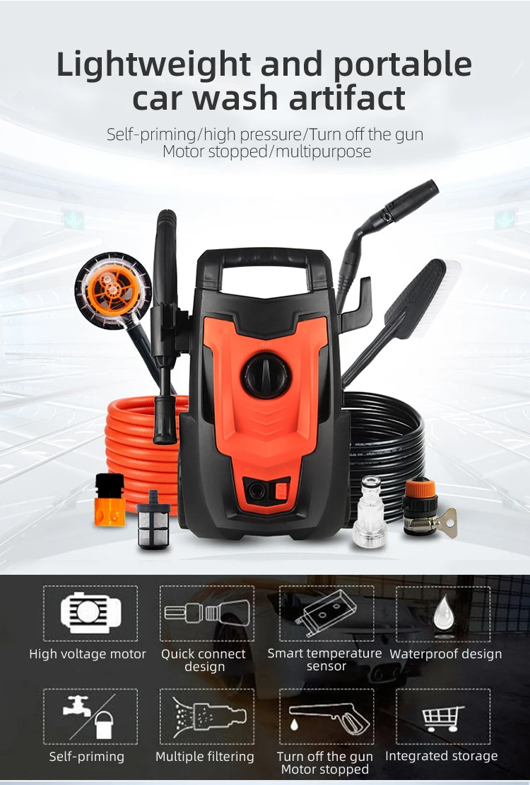 Features | 1. Large motor, sufficient material;2. Real Core, long life span; 3. Booster pump head,double filters does not break; 4. 8 meters high pressure, helium jet; 5. Automatic air venting, fast intelligent water; 6. Automatic power off; 7. All copper quick connector, does not leak; 8. Multiple water spray mode; 9. Small body big power. |