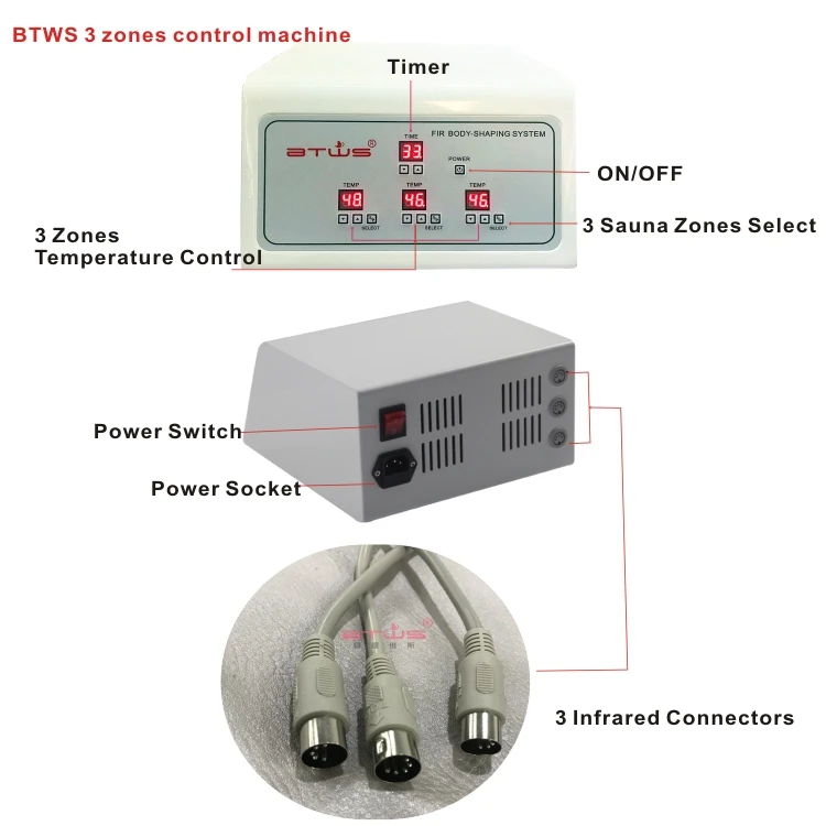 Sauna Features | 1.High-end PU leather, magic glue to adjust the blanket 2.luxury Digital controller machine (not plastic one) carbon fiber heating element not common wires 3.capacity trip over-heating protection (1in mainframe&2in each zone) 4.CE,RoHs Approved 5.BIG size:180*190cm | ||||||