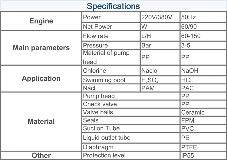 Model | Flow rate (L/H) | Pressure (Bar) | Frequency stroke/min | Suction (m) | Power (Watt) | Voltage (V) | GW (kg) |