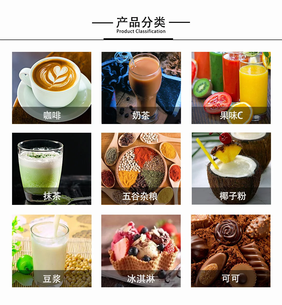 Cereal meal,Milk tea,Soybean powder,Ginger tea,Coffee