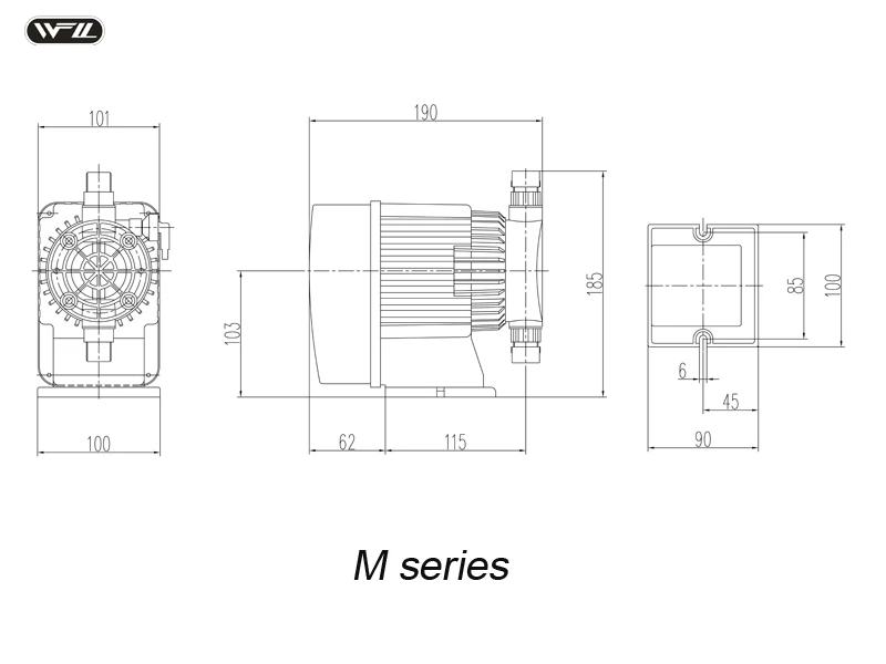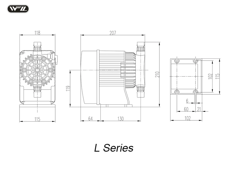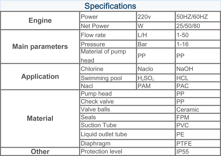 Model | Flow rate (L/H) | Pressure (Bar) | Frequency stroke/min | Suction (m) | Power (Watt) | Voltage (V) | GW (kg) |