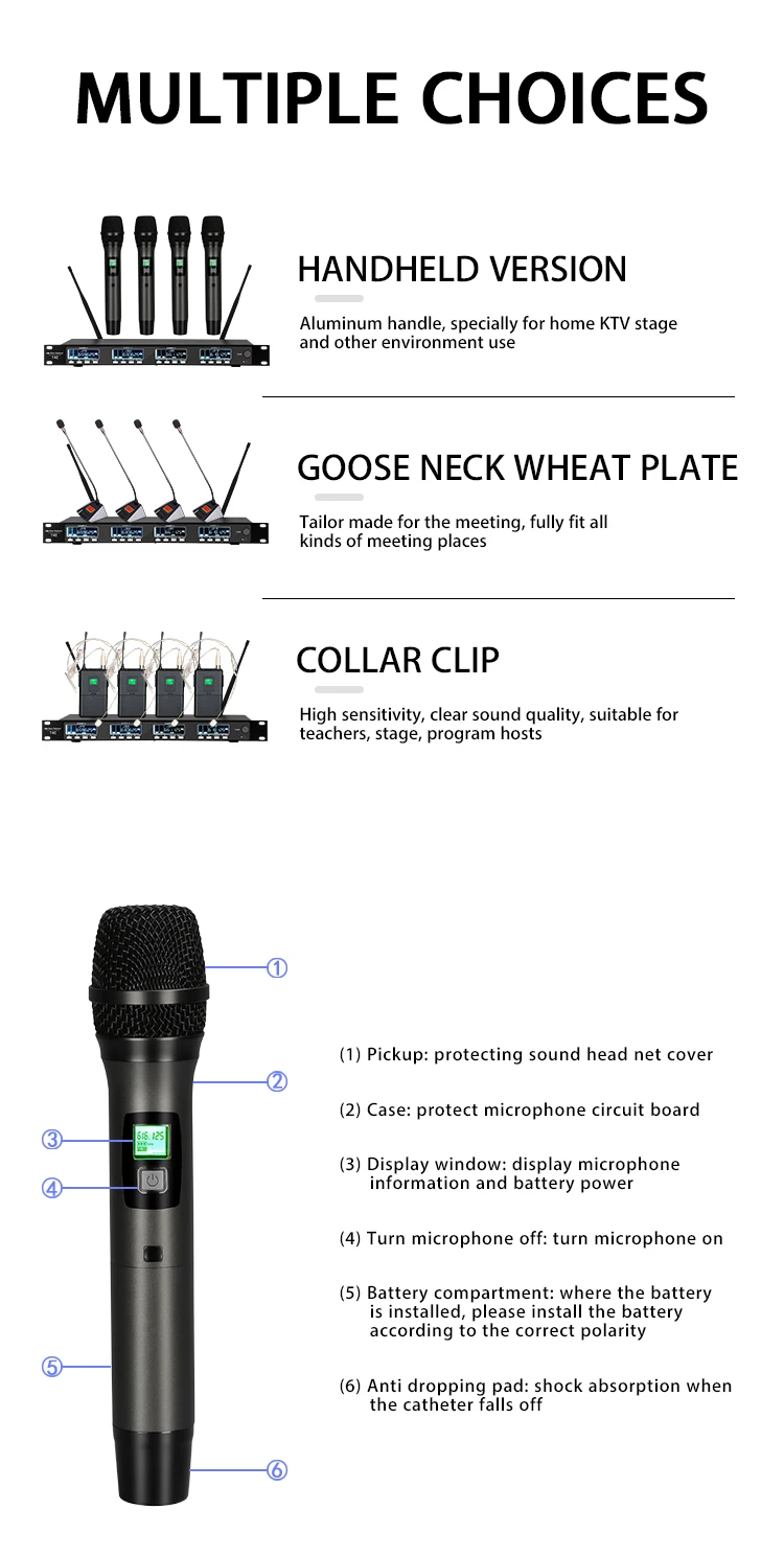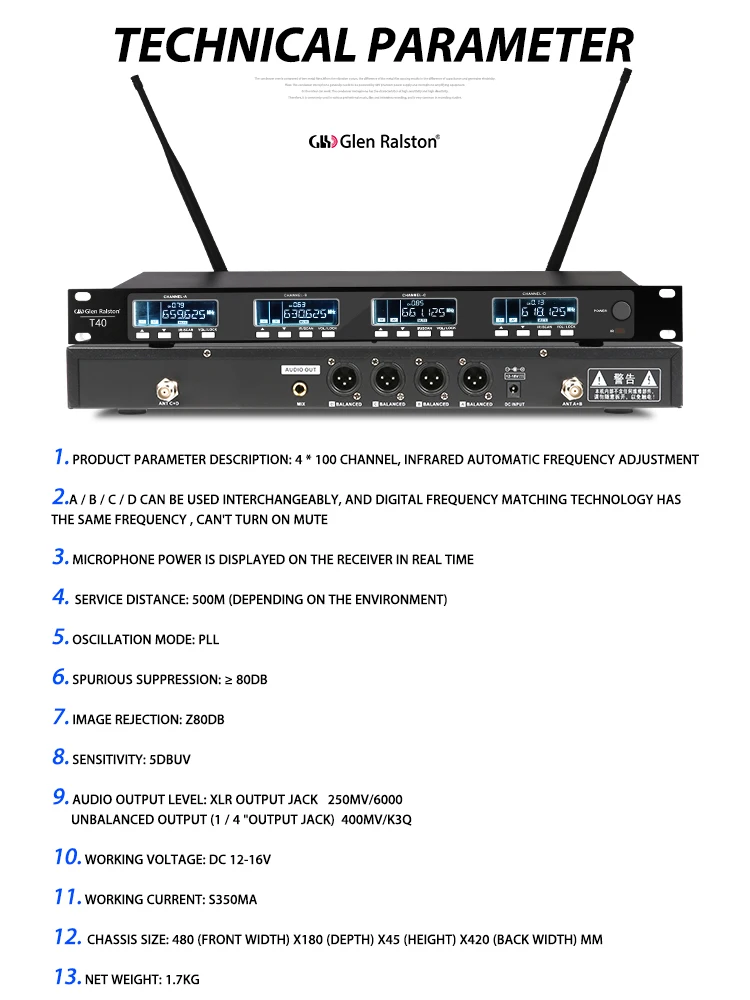 Techinical Specification | 1. Product parameter description: 4 * 100 channel, infrared automatic frequency adjustment 2.A / B / C / D can be used interchangeably, and digital frequency matching technology has the same frequency , Can't turn on mute 3. Microphone power is displayed on the receiver in real time 4. Service distance: 500M (depending on the environment) 5. Oscillation mode: PLL 6.Spurious suppression: ≥ 80dB 7. Image rejection: z80db 8. Sensitivity: 5dbuv 9. Audio output level: XLR output jack 250mV/6000 Unbalanced output (1 / 4 "output jack) 400mV/k3Q 10. Working voltage: DC 12-16v 11. Working current: s350ma 12. Chassis size: 480(front width) x180 (depth) x45 (height) X420 (back width) mm 13. Net weight: 1.7kg | ||||||