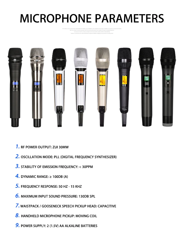 Microphone parameters | 1. RF power output: Zui 30MW 2. Oscillation mode: PLL (digital frequency synthesizer) 3. Stability of emission frequency: < 30ppm 4. Dynamic range: ≥ 100dB (a) 5. Frequency response: 50 Hz - 15 kHz 6. Maximum input sound pressure: 130dB SPL 7. Waistpack /Gooseneck Speech pickup head: capacitive 8.Handheld microphone pickup: moving coil 9. Power supply: 2 (1.5V) AA alkaline batteries | ||||||