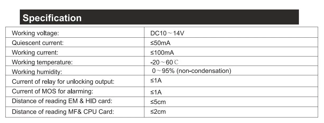 Support EM & HID card (125KHz), Mifaree & CPU card (13.56MHz). Open door by optical induction fingerprint, with low power consumption. Working mode can be set: controller mode, reader mode, interlock mode and demo mode. Support: card + fingerprint, multi users, total five ways to open door. Support super card (fingerprint). Support: add user card, delete user card, anti-duress card, authorization card and normal open card. Support Set-card (fingerprint) operation to enter the management menu quickly. User capacity up to 20000 (fingerprint 219), capacity of Admin card (fingerprint) up to 21. Infrared tamper technology, could alarm at night.