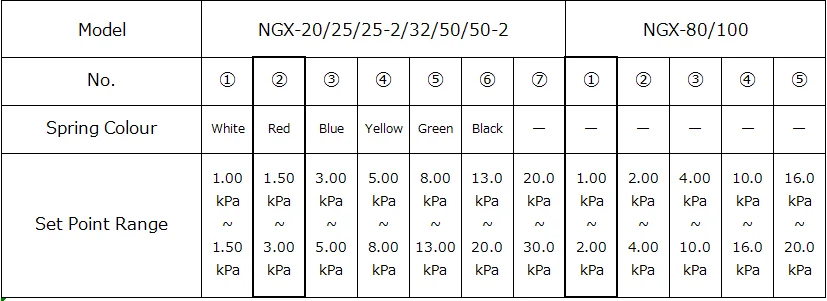 The NGX Range is a direct-operated high performance governor with built-in strainers, and intergrated JIS flanges. It is suitable to install it indoors since the safety relief valve is not incorporated. A tought lightweight aluminum alloy is used for the body of NGX-20~50, no excessive load is applied to the pipings. The diaphragm case can be removed while the main body is still installed on the piping; maintenance parts (valve disc, diaphragm, O-ring, etc.) can be easily replaced even in a narrow space.