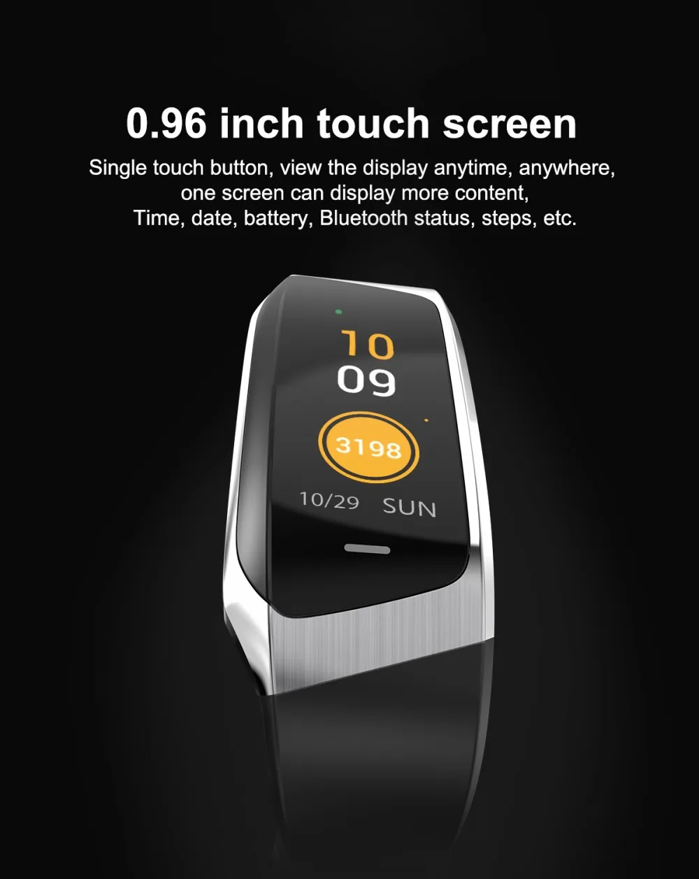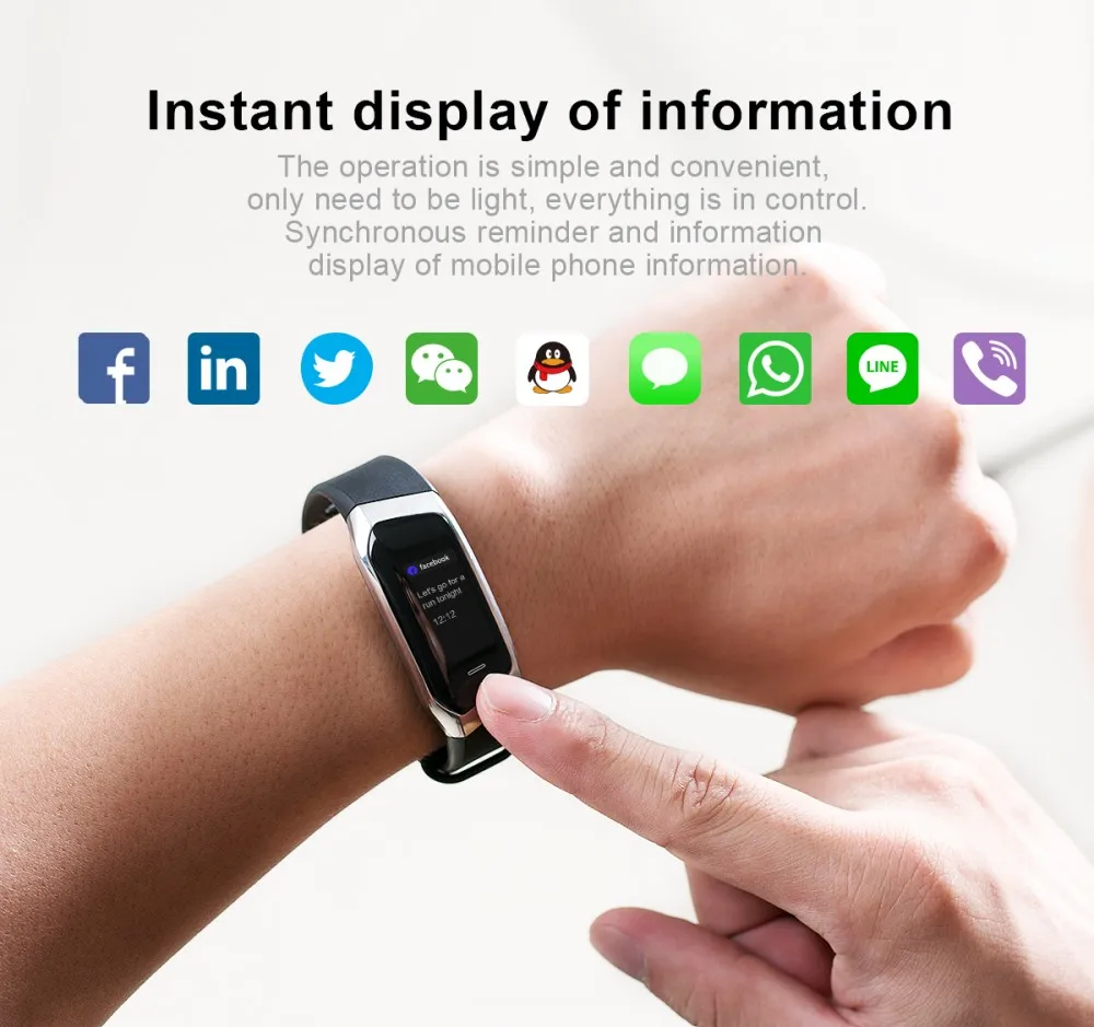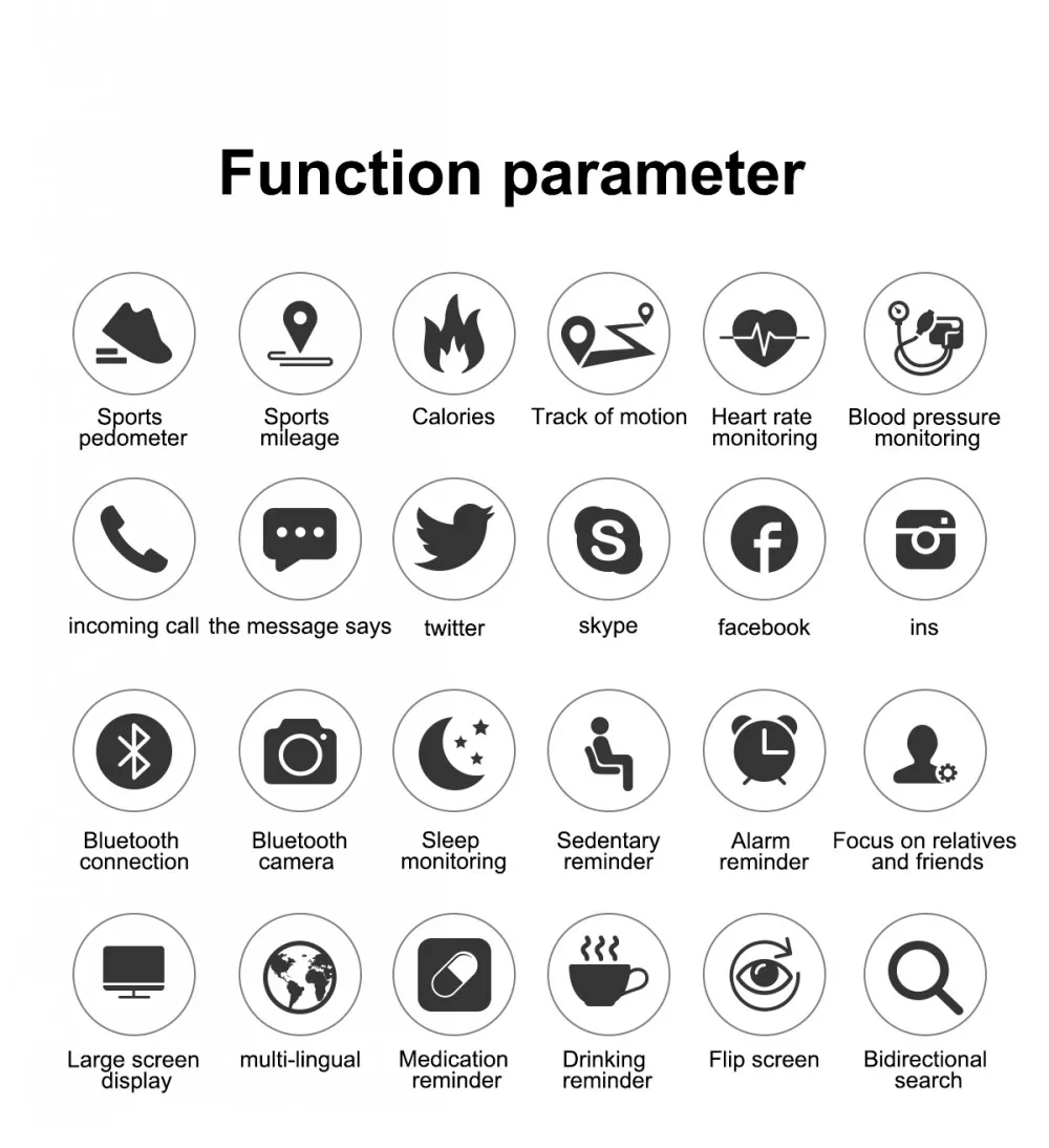Typical functions:Time, switch display, meter step, Heart rate, blood pressure monitoring Movement:Calorie expenditure,Mileage,duration,speed Sleep:Sleep monitoring(sleep duration,sleep quality) Notifications of mobile phone notifications:Call to inform,Information push,The alarm clock to remind,Sedentary remind Features:Remote control picture,Looking for mobile phone,Pay attention to friends The characteristics of:The product surface shell adopts ABS and special powder metallurgy technology, with high surface hardness, flat surface, surface TPU, material environmental protection level, various UI themes