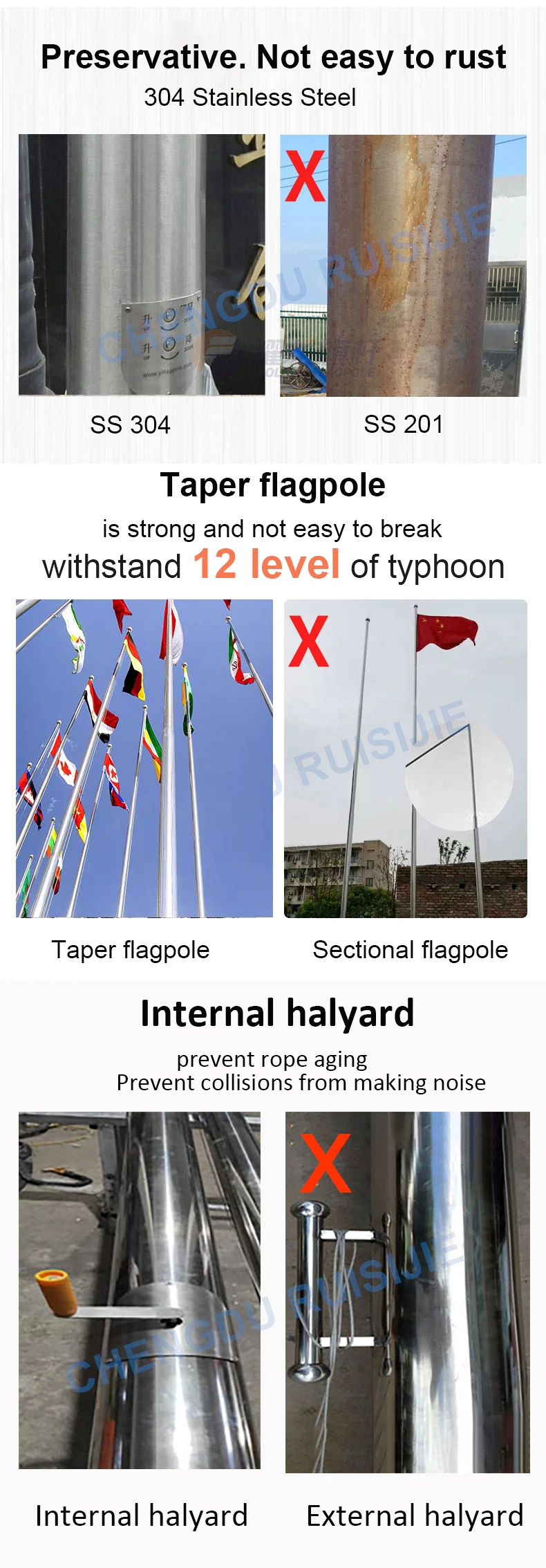 RICJ's main business: stainless steel flagpole, electric flagpole, horizontal award banner flagpole, wind-moving flagpole, roadblock machine, bollard post, tire killer, road pile, the products are mainly used in various well-known enterprises, star hotels, government, squares, stadiums, schools and other places.