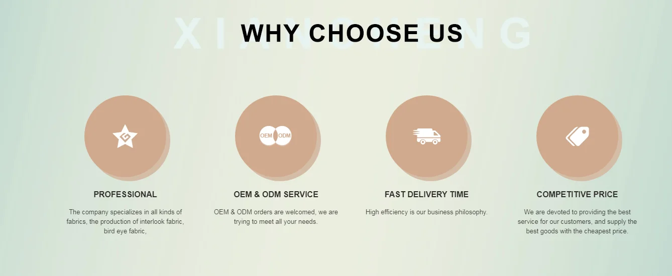 Shaoxing Xiancheng Trading Co., LTD is located in International Trade Center, Keqiao District, Shaoxing city, with convenient transportation. Adjacent to Ningbo and Shanghai port, only 15 kilometers away from Xiaoshan International Airport, superior market environment. The company specializes in all kinds of fabrics, the production of interlook fabric, bird eye fabric, air layer fabric,polar fleece fabric, Roman fabric and so on. The company has a high-quality export team, products are mainly sold to Africa, South America, Southeast Asia countries. Our first-class service, accurate delivery, stable quality and good reputation won thetrust of our customers. We are willing to establish business relations with our customers on the basis of mutual benefit to develop together and create a better future.