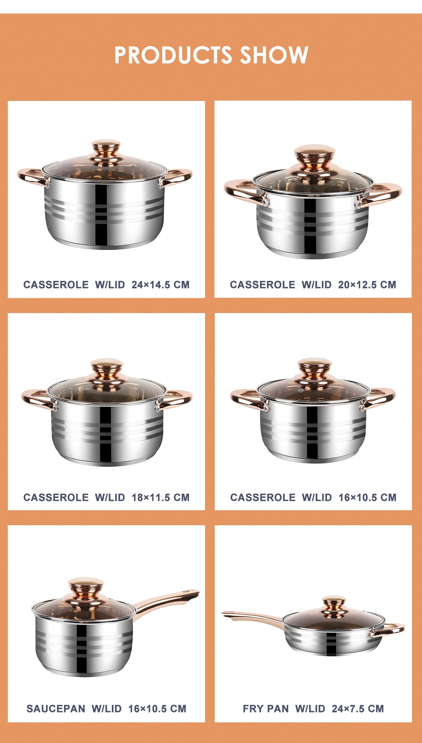 Size: | 16*9.5cm Saucepan w/lid 16*9.5cm Casserole w/lid 18*10.5cm Casserole w/lid 20*11.5cm Casserole w/lid 24*13.5cm Casserole w/lid 24*6.5cm Fry Pan w/lid |