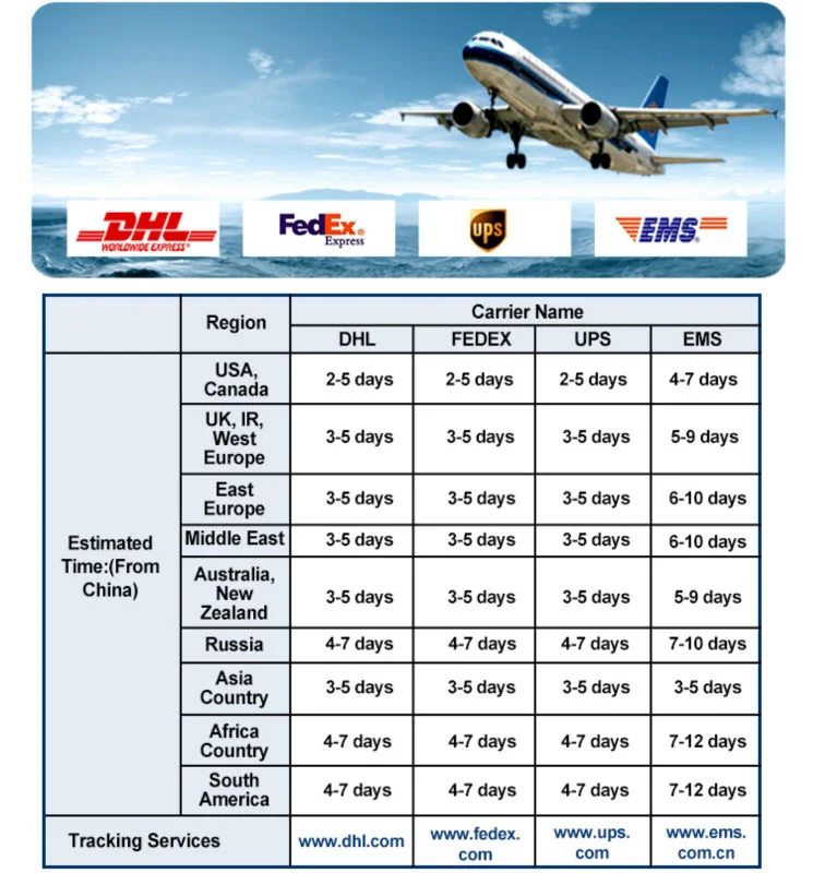 Shiping Way: | DHL, FedEx, UPS, TNT, EMS, ARAMEX, By Air | |
