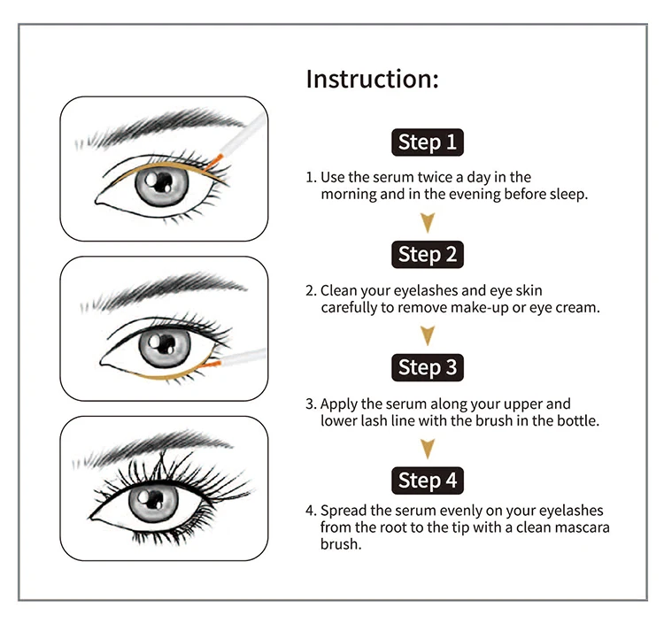 Usage | 1. Apply the product carefully to upper and lower eyelids. 2. Spread a little growth liquid on the brush head and apply it along the eyelash root to the tip. 3. Once in the morning and once in the evening |