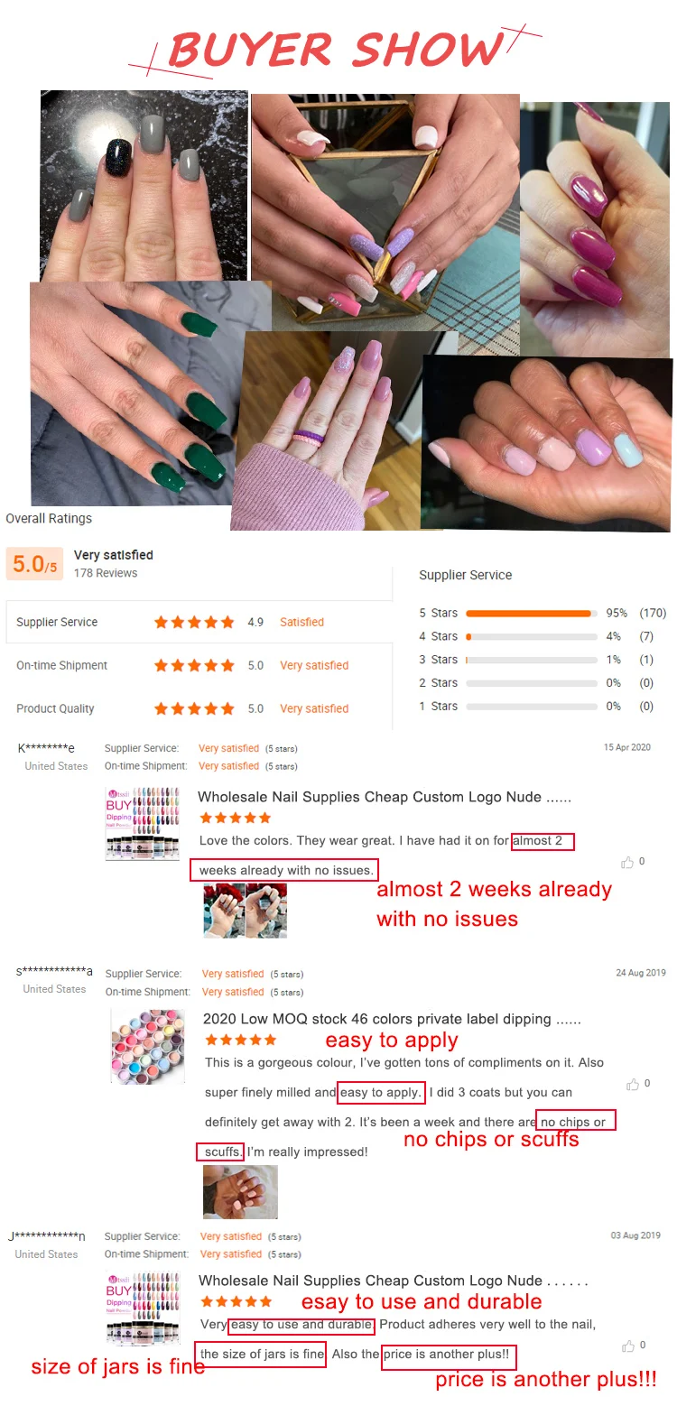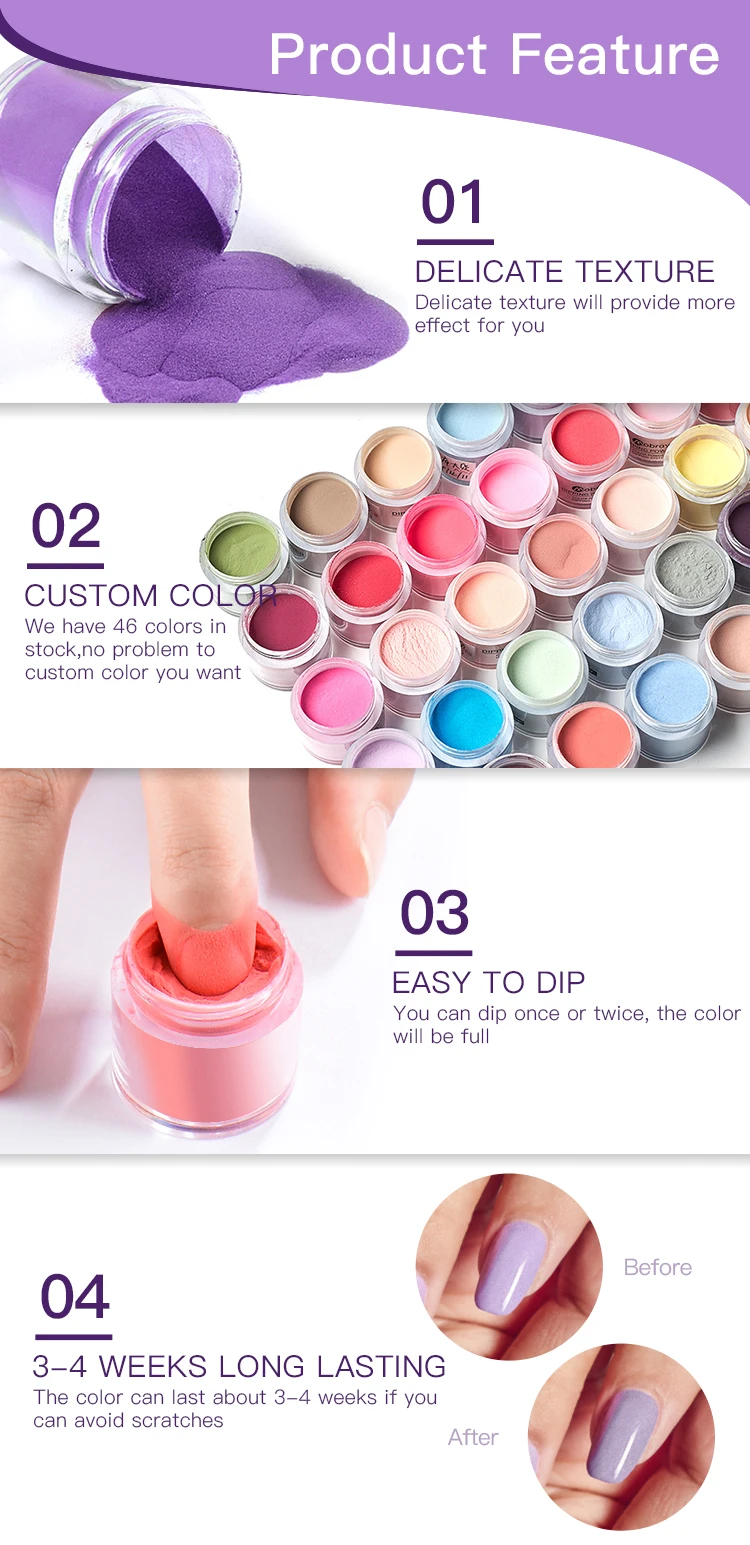 Feature | 1. The Dipping Nail Powder is easy to do it with a french and gradient effect. 2. To create a protective layer, strengthen your own natural nails, promote longer and stronger nails which don't split or peel. 3. The advantages are simple and quick to apply, more durablethan nail polish, and the disadvantage is that it is not easy to remove(in the same way as the nail gel) 4.Can be used on natural nails and false nails. 5.Provide a fantastic natural look for your nails. 6.Perfect for home use or professional use. |
