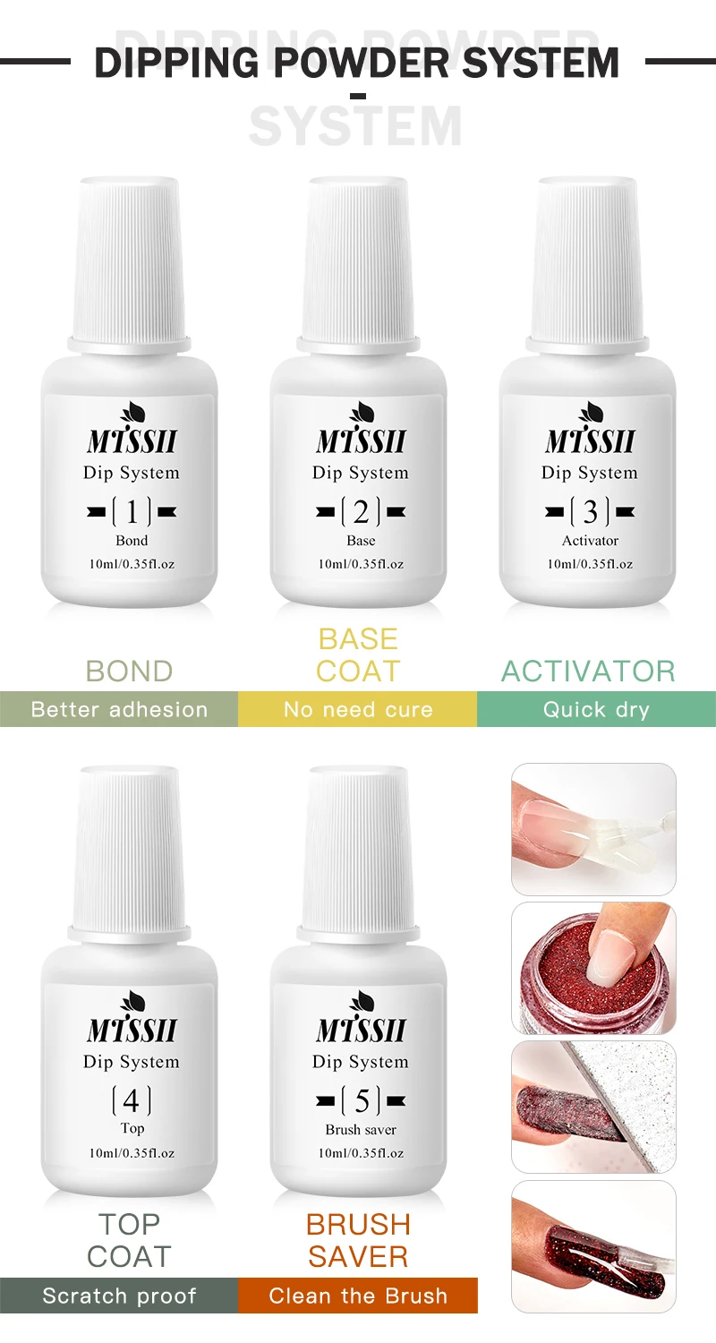 Dipping Nail Powder steps | 1. Prepare your nail. 2. Apply a thin coat of dip base. 3. Dip tip of the entire nail into the dish. 4. Brush off excess powder. 5. Apply a second coat of dip Base Coat . 6. Dip tip of a nail into the dish to achieve desired smile line. 7. Brush off excess powder. 8. Apply dip ACTIVATOR. 9. Smooth and refine the surface with a buffer. 10. Apply top coat |