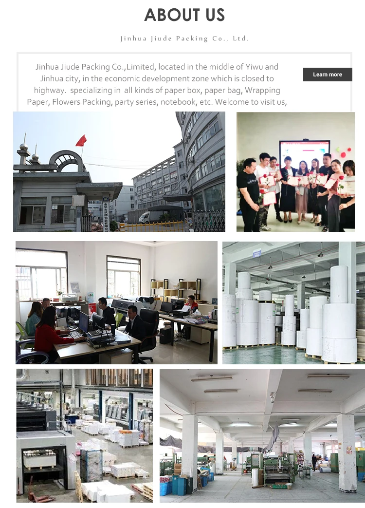 Jinhua Jiude Packing Co.,Ltd (Jude Packing Co.,Ltd) is specialised in manufacturing gift wrapping paper,tissue paper,foil and paper related items such as bags, boxes, crafts, notebooks, accessories and more. We also offer comprehensive solutions for decoration.