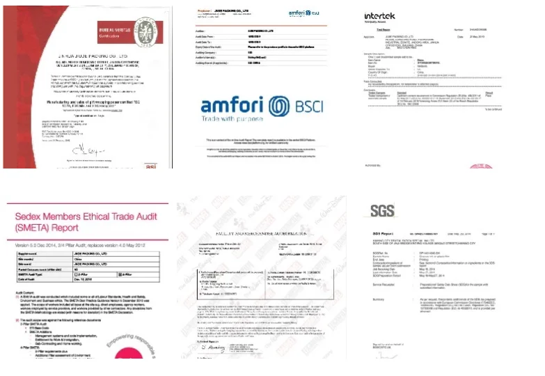 Our products meet FSC,SEDEX, REACH,BSCI and SGS standards, and have been widely received in USA and Europe. In addition, our factory is trusted by Walmart.
