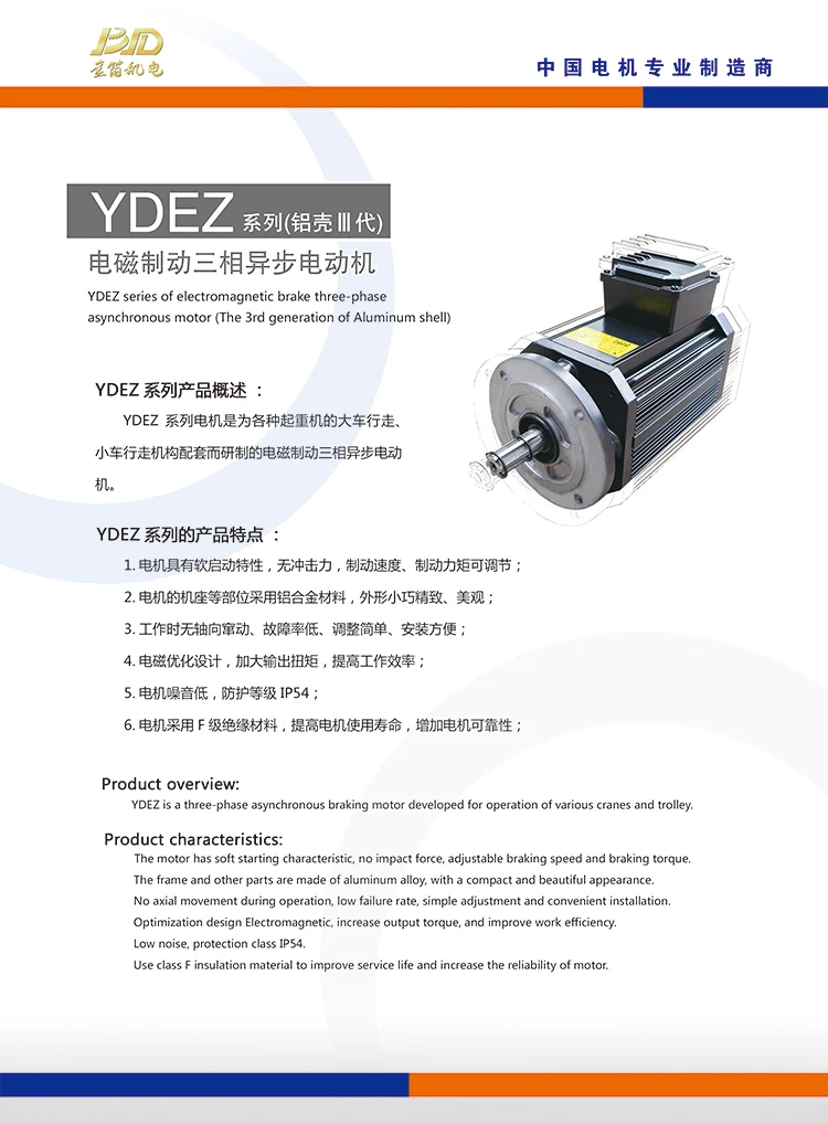 Product overview: YDEZ is a three-phase asynchronous braking motor developed for operation of various cranes and trolley.