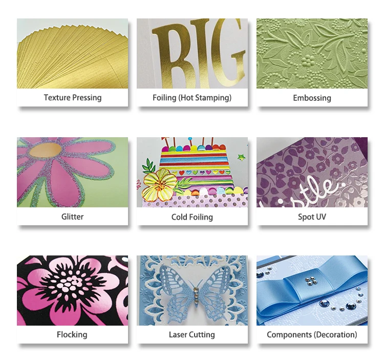 Surface Finishing | 1) 3D Lentivular Printing; 2) Cold Foil Printing; 3)Glossy/Matte varnishing; 4) Embossing; 5) Color foiling/ Hot stamping; 6) Complete or Spot UV; 7) Glitter; 8) Embossing; 9) Laser cutting; 10) Texture pressing; 11) Germs/ ribbon bow/ sequins/ paper pompon etc. decoration; |