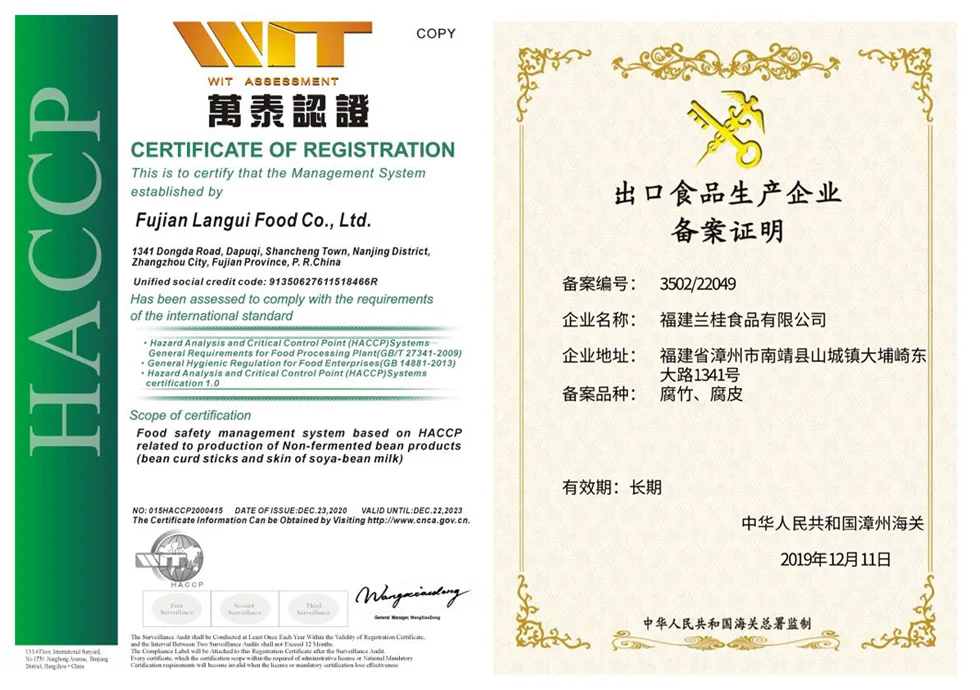 We, LANGUI Food Co., Ltd., established in 2013.We have 25 acres company area and 10000 square meters of building area.We are located in the good-view city in Nanjing County,Zhangzhou City, Fujian Province. We are specialized in soy bean-curd skin and bean-curd stick developing,production and selling.As a leader of the machined-made bean-cured skin production in China, we have the excellent facilities and innovative technology team. This kind of technical force is abundant to face any kind of challenges from outside. We have standardized sterile workshops with 100 advanced production lines to fulfil any type of mass demand . We mainly produce soybean products, such as mechanized bean curd skin, Fresh Bean curd Rolls,Fresh bean curd skin, Fresh bean curd sticks, Fried bean curd Rolls,etc. Our bean curd skin product is made from well selected NON-GMO soybeans which is grind with natural mountain spring water. It has excellent features as below: as thin as a cicada's wings,nice oleosus appearance and flexible, non rotten when soak in water,no broken when fried in oil,etc. Accompanied with rapid rising of food service industry,to fulfil domestic and foreign marketing requirement, our soybean curd skin products requirement keep rising to be used in food processing industry, benefited from the high quality, nice adaptability and competitive price. Based on principle of mutual benefit and mutual development, we sincerely look forward to cooperate with customers in home and abroad.
