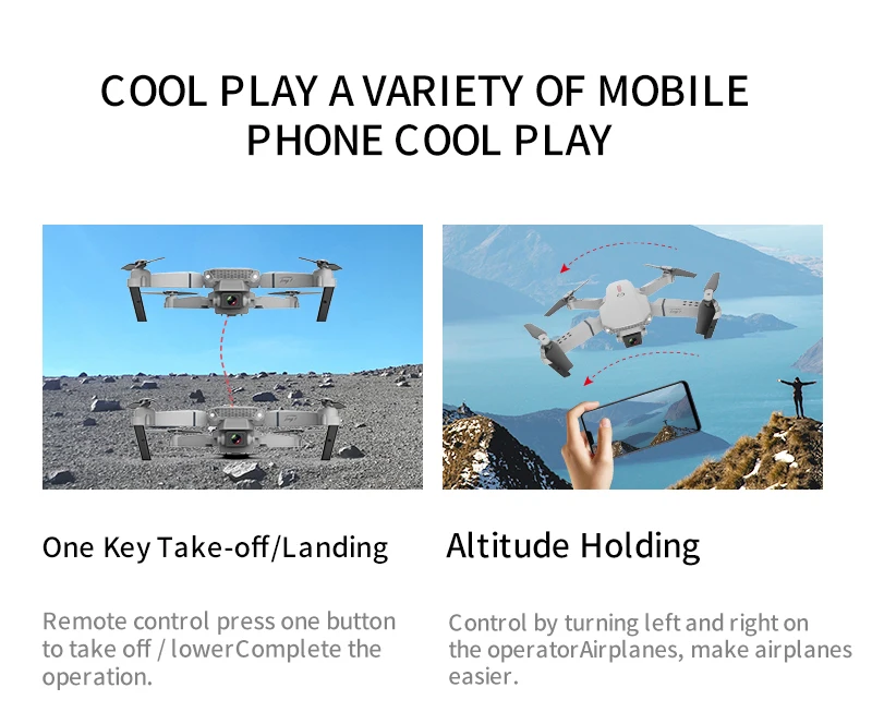 Product Features | The fuselage folds, one-button take-off, one-button landing, hovering at fixed altitude, and fixed altitude by air pressure WiFi connection, APP control, gesture camera, gesture video, one-click return home,Headless mode, trajectory flight, gravity sensor, speed adjustment, real-time transmission,MV picture and video sharing, dual cameras |