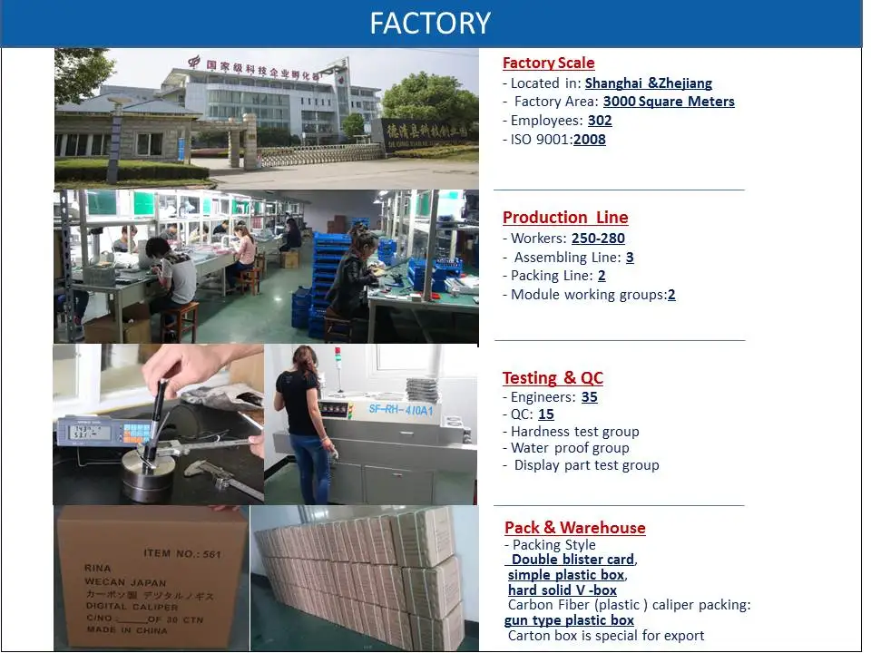Packing Details: For example, 0-150mm caliper Carton dimensions:51/29/38.5cm Quantity/inner box: 10pcs Quantity/carton: 40pcs G.W/N.W:18/17pcs Quantity of20GP/40GP/40HQ:16840pcs/37890pcs/47719pcs |