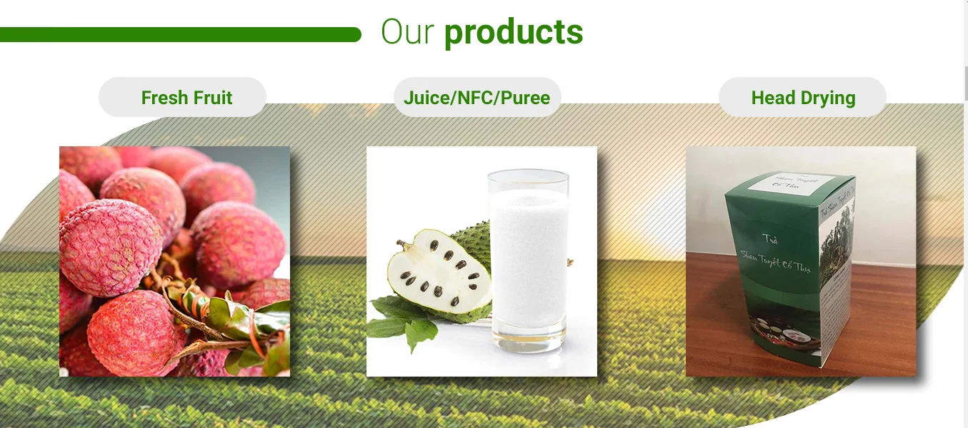 ADVANTAGES 100% NATURAL Products are selected and processed entirely from natural raw materials, no additives, no preservatives and no residues of plant protection drugs... SUSTAINABLE PRODUCTS: Products are built and developed in a sustainable and closed value chain by developing disease-free and high-yielding plant varieties until the planning and management of raw material areas meeting international standards. ALWAYS FRESH The factory is located in the raw material area so that the fruits after being harvested will be put right into the production and packaging lines to ensure the best quality products. TOP QUALITY Products are manufactured directly from natural materials using advanced technology lines, quality control processes according to international standards to provide standard products to the world CERTIFICATIONS • HACCP • VietGAP • GLOBAL G.A.P • ISO 22000 BUREAU VERITAS. • ISOCERT