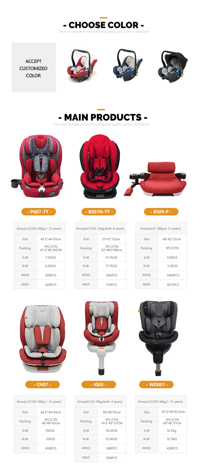 Q6: How many kinds of the products do you have? A6: Our products cover all types of child safety seats.
