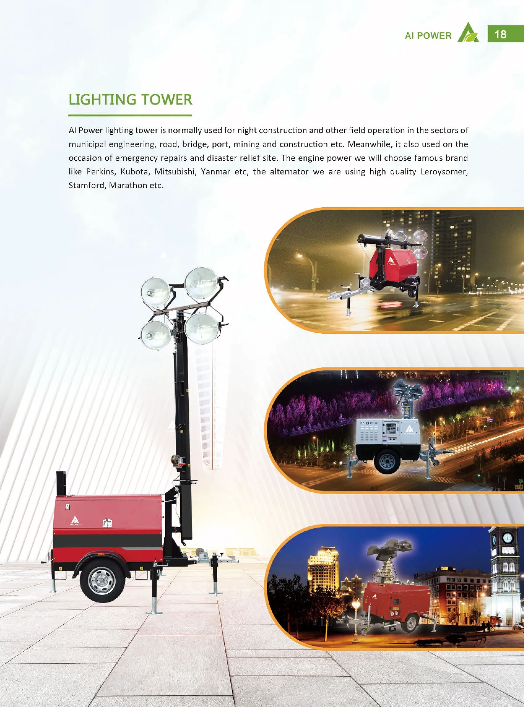 Ai Power focus on the industry in innovative light tower solutions. Our vertical mast and compact light towers have revolutionized industrial mobile lighting. Easy to setup, operate and maintain, our light towers provide maximum power in a minimal footprint. With extended run times and service intervals, LED safety features, innovative engine technologies and programmable controls, our products can be trusted to maximize uptime and return on your investment.