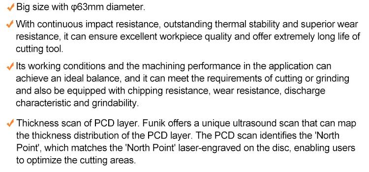Funik manufactures PCD cutting tool blank with 63mm diameter. This is the largest diameter PCD cutting tool blank which are made in China. The performance and quality of this large-diameter cutting tool blank is equal in performance to the highest world-class standards.