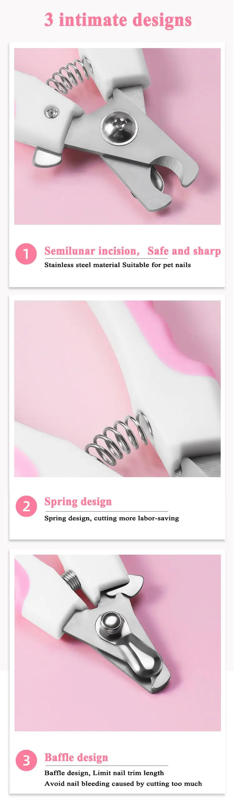 -Long-lasting and durable spring action -Easy, safe and convenient to use -Sharp Stainless Steel blades -Prevent cutting the nail too deeply -Comfortable handle -Suitable for: Dogs, cats, rabbits and any other pets with long nails