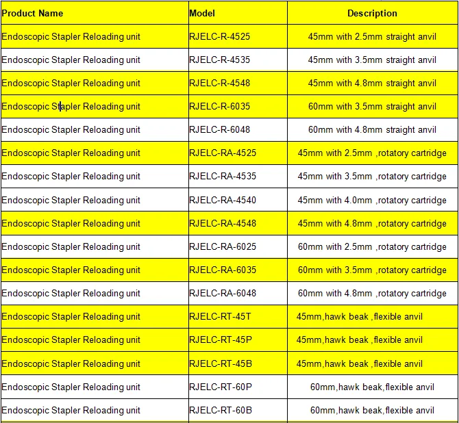The Endo Linear Cutter Stapler is available for three different length of Short(RJELC-BS) , standard (RJELC-BM)and long shaft (RJELC-BL), it will accommodate any of the reloading unit sizes that are available in 30mm, 45mm, and 60mm length. The Endo Linear Cutter Stapler with either the 2.5mm, 3.5mm reloading unit is designed for introduction and use through a 12mm trocar sleeve, or larger, with the use of a converter. When using the Endo Linear Cutter Stapler with the 4.8mm reloading unit, it must be inserted into a 15mm trocar sleeve. The instrument may be reloaded and fired up to 25 times in a single procedure.