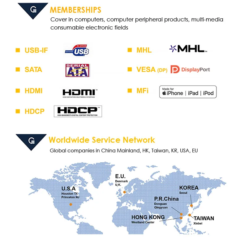 5) Industry membership: USB-IF, MHL, SATA, VESA (DP), HDMI, MFi, HDCP......