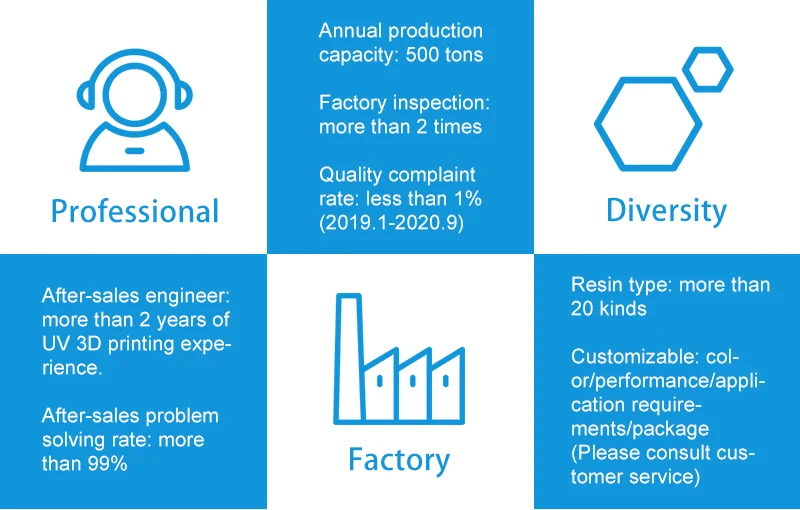 Godsaid3d was established in 2016,has been focusing on the research and development of LCD/DLP 3D printer resins,include model resin/engineering resin/castable resin/dental resin/high temperature resin/flexible resin/water-washable resin etc.