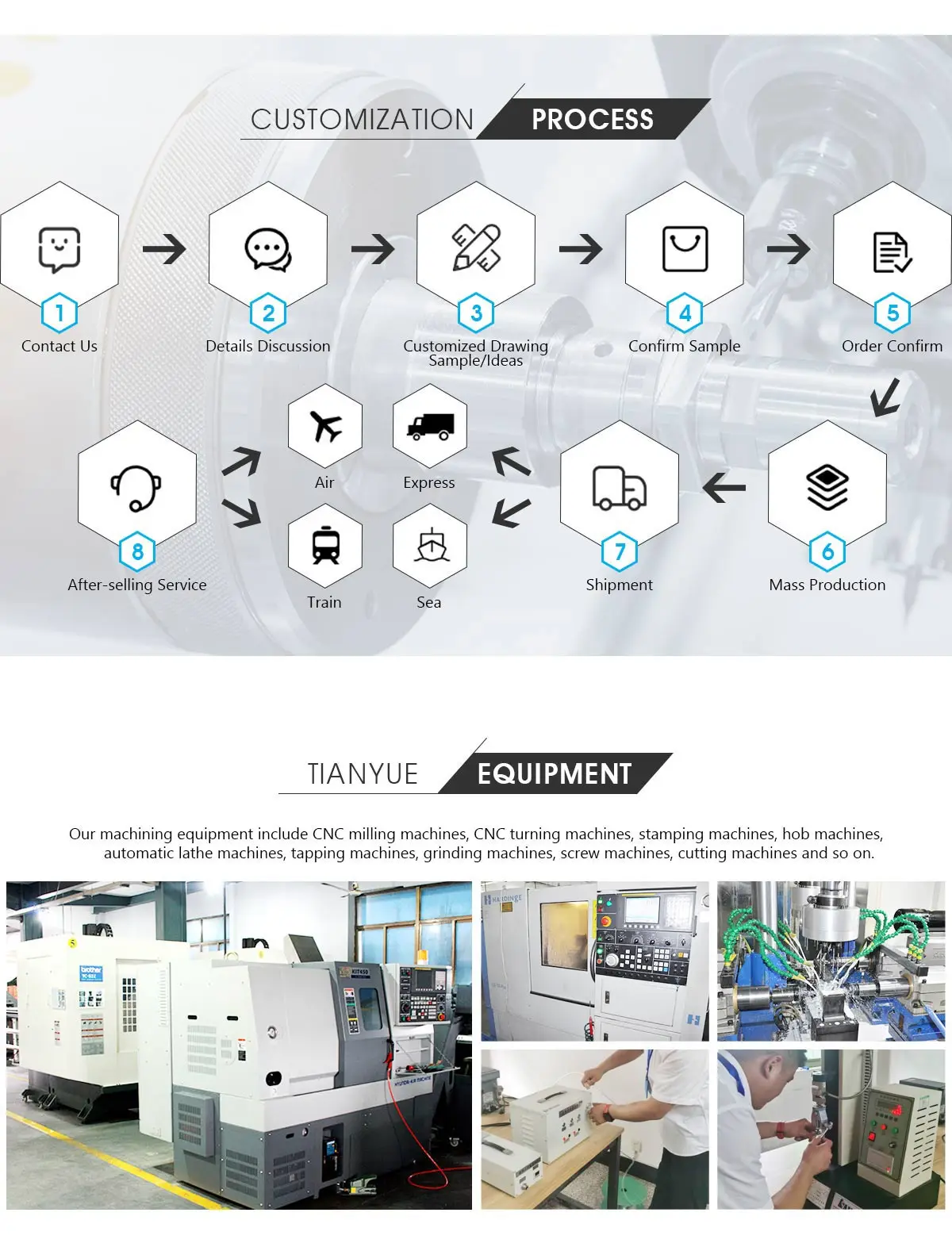 A.Our advantage is the competitive prices, fast delivery and high quality. Our employees are responsible-oriented,friendly-oriented,and diligent-oriented. our Industrial parts products are featured by strict tolerance, smooth finish and long-life performance.、