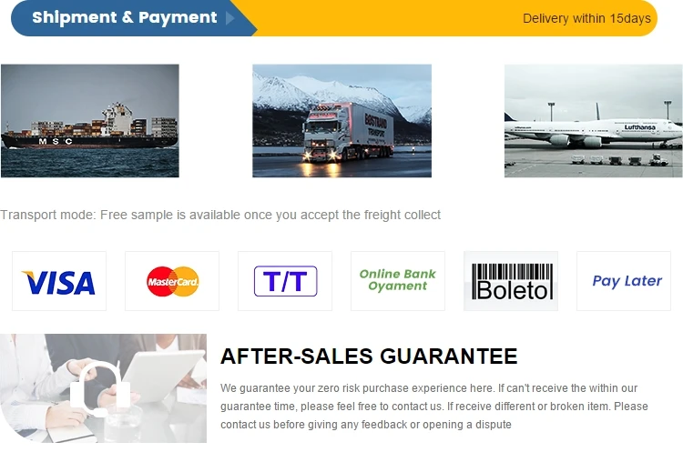A:We are honered to offer you samples.once samples confirmed ,50% deposit before production for below 10,000 usd ,the goods will be shipped out after the full balance reach .