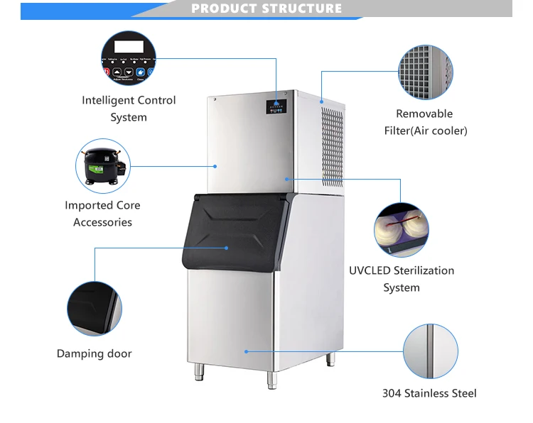 SD-500 | Cube Ice 22*22*22mm | 220KG | Air | R404a | 950W | 150KG | 560*830*1650mm |