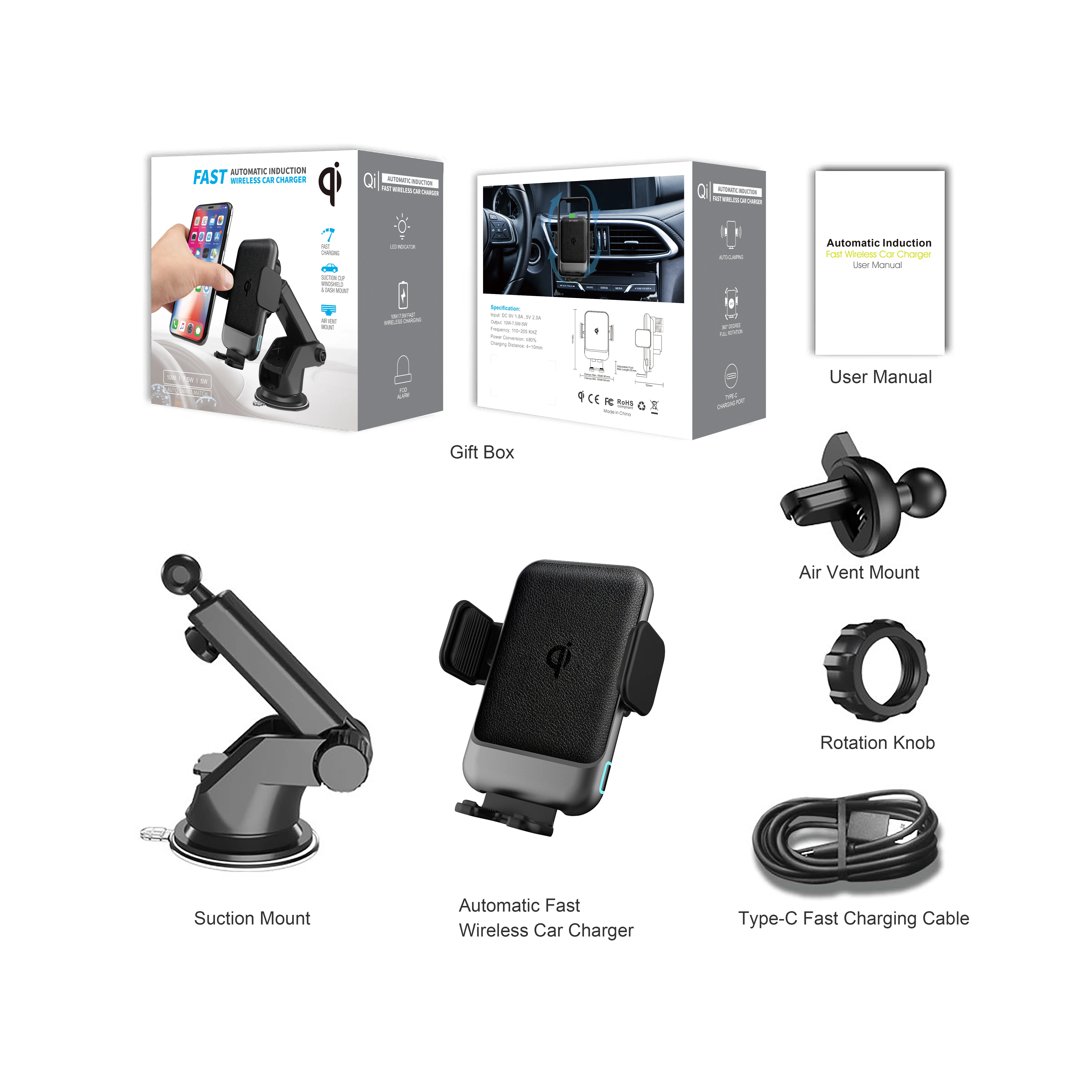Package Contents | 1* Automatic Induction Fast Wireless Car Charger 1* Air Vent Mount 1* Suction Mount 1* Type-C Fast Charging Cable 1* User Manual 1* Retailer Gift Box |