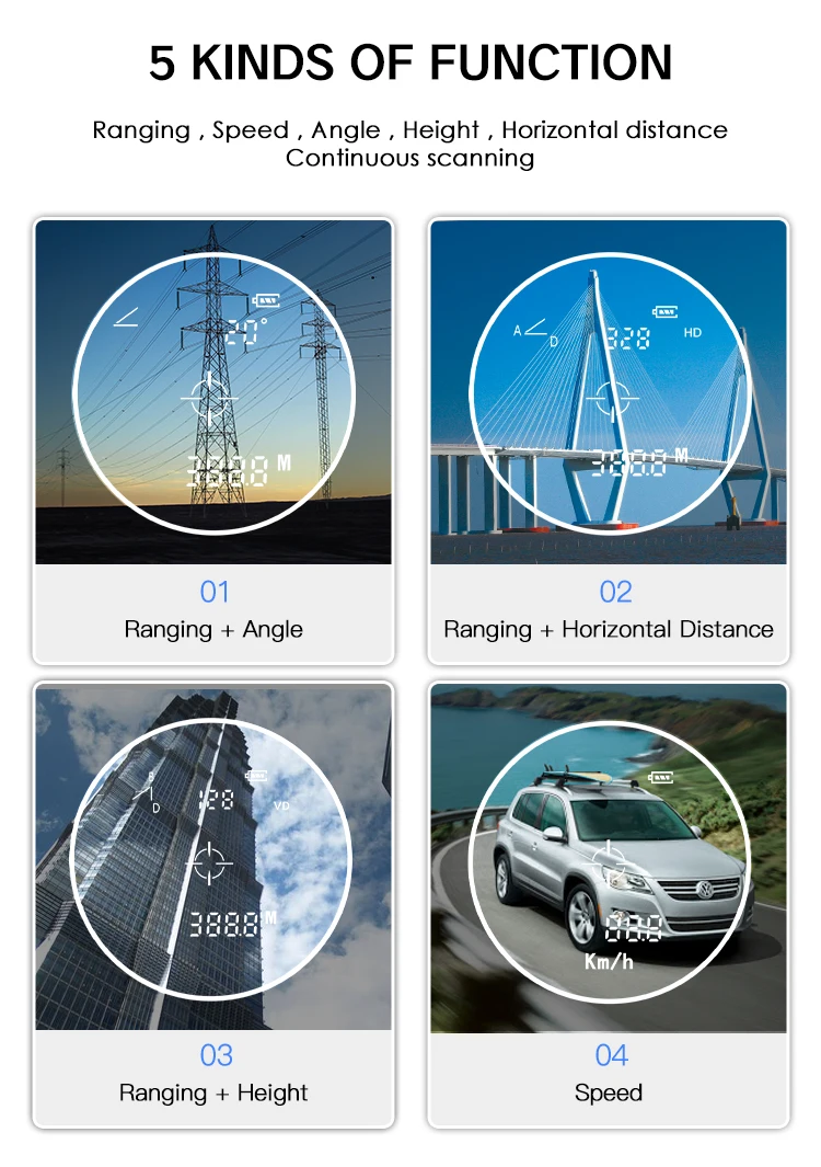 Function | range/angle/scan/falg lock /Slope correction/jolt/height/Horizontal distance/speed/ |