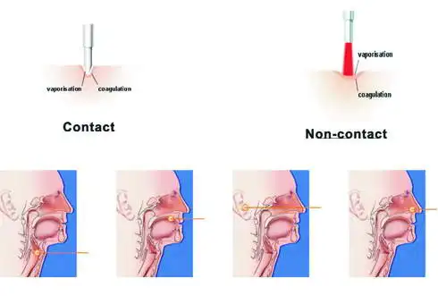 Application techniques 1. It can be used in contact mode, in which the tip of the fiber is placed directly on the surface of the tissue. This mode is effective for both photocoagulation and vaporization of tissue, depending on the power density. At the low- or mid-power range, coagulation occurs; at a higher level, vaporization occurs. 2. The laser can be used in near-contact mode, in which the tip of the fiber remains several millimeters apart from the tissue. This mode is largely used for tissue photo coagulation 3. The laser can be used for interstitial laser-induced thermotherapy, a minimally invasive method of treating both benign and malignant tumors. The laser is placed through puncture holes in the skin, and its energy is absorbed by local tissues. This hyperthermic state causes either immediate or delayed tissue necrosis via coagulation. 4. In the clinic most cases can be done after administering a topical anesthetic and a decongestant spray to the nasal cavity, but micro laryngeal surgery needs General anesthesia with special fleximetalic tube to prevent fire hazard.