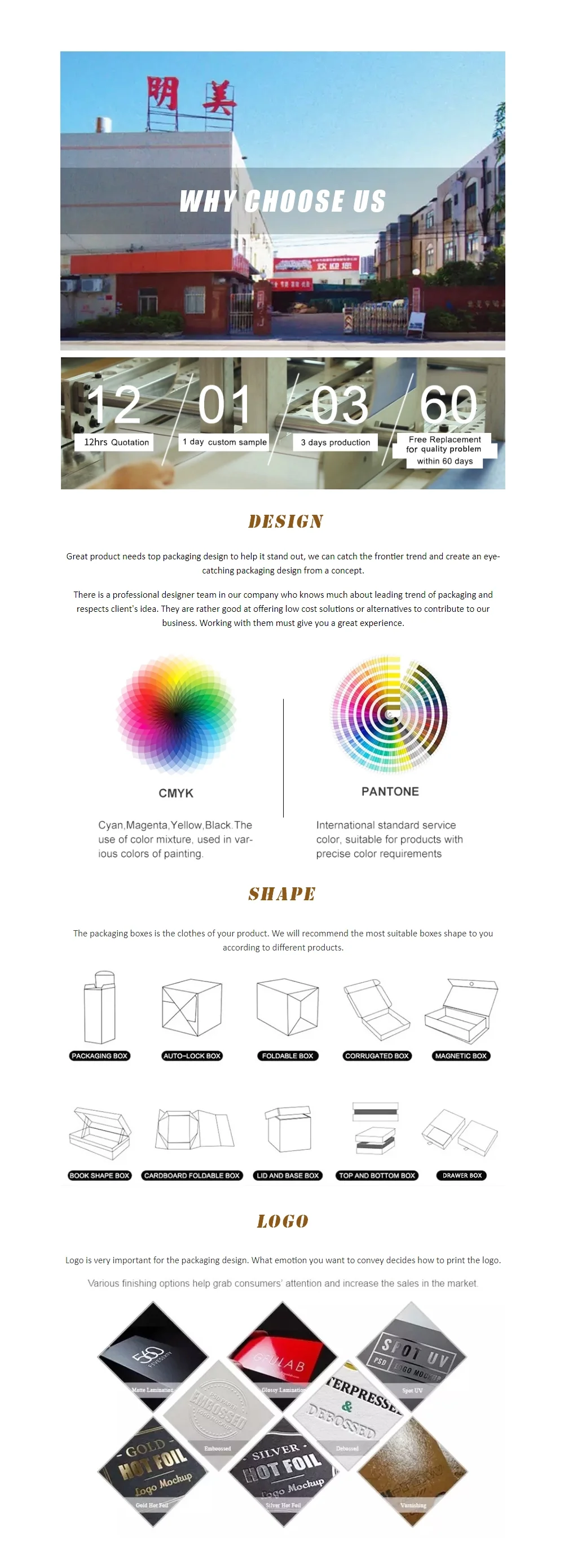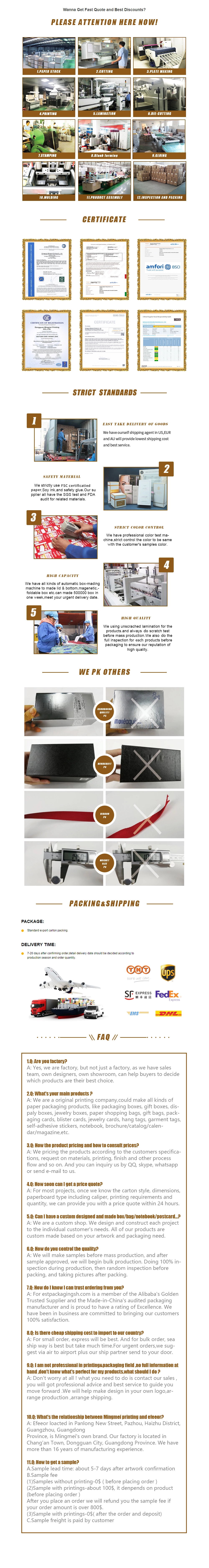 | Finishing | Glossy/matt lamination, Glossy/matt varnishing, Debossing/embossing, Gold/silver stamping,etc. |