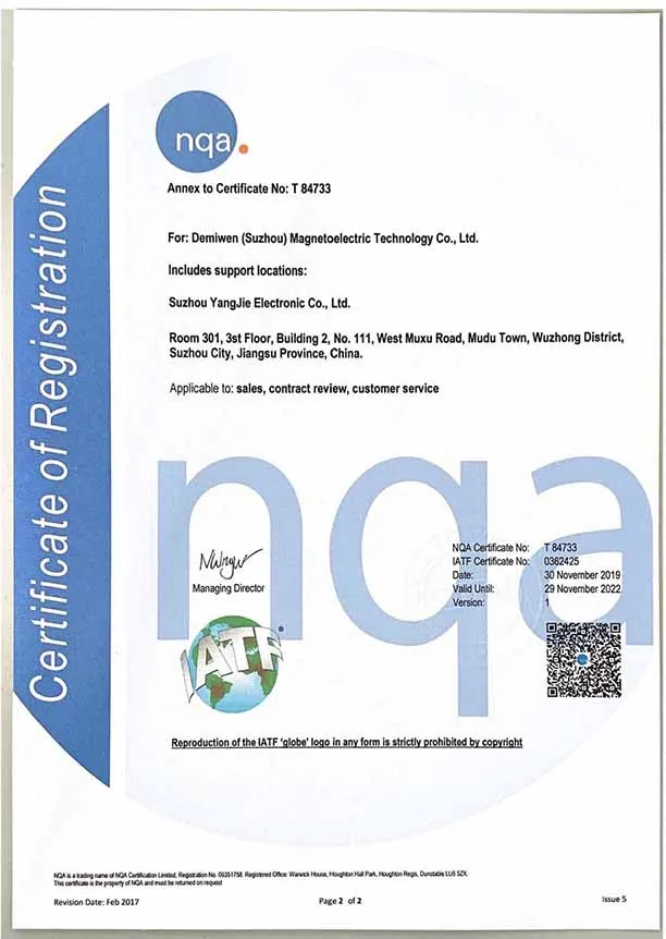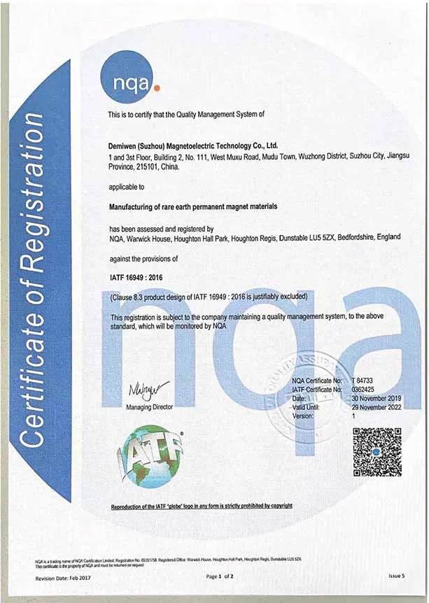 The current output capability for NdFeB magnet has exceeded 3000 tons per year. NdFeB magnets are sold in domestic markets as well as abroad such as Southeast Asia, Europe, America, Australia, etc. We have well established corporative relationship with Apple, LG, Sony, Samsung, Quanta, Foxconn, Sanyo, Delta, Mitsubishi, Panasonic, Sharp, Daewoo, Asus, BenQ,etc. DMW has built a professional quality management system based on IATF 16949.