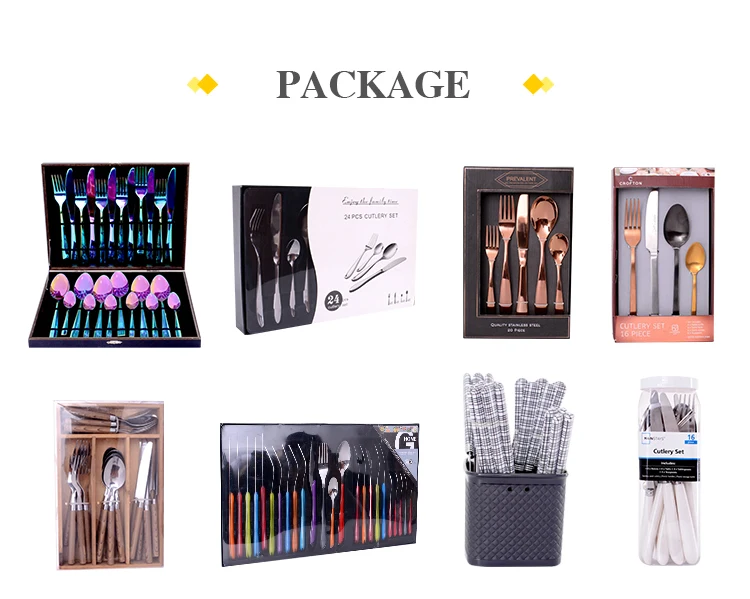 Description | 1 Set (24pcs) :6 dinner spoons, 6 tea spoons, 6 forks and 6 knifes 1 Set (16pcs) :4 dinner spoons, 4 tea spoons, 4 forks and 4 knifes |