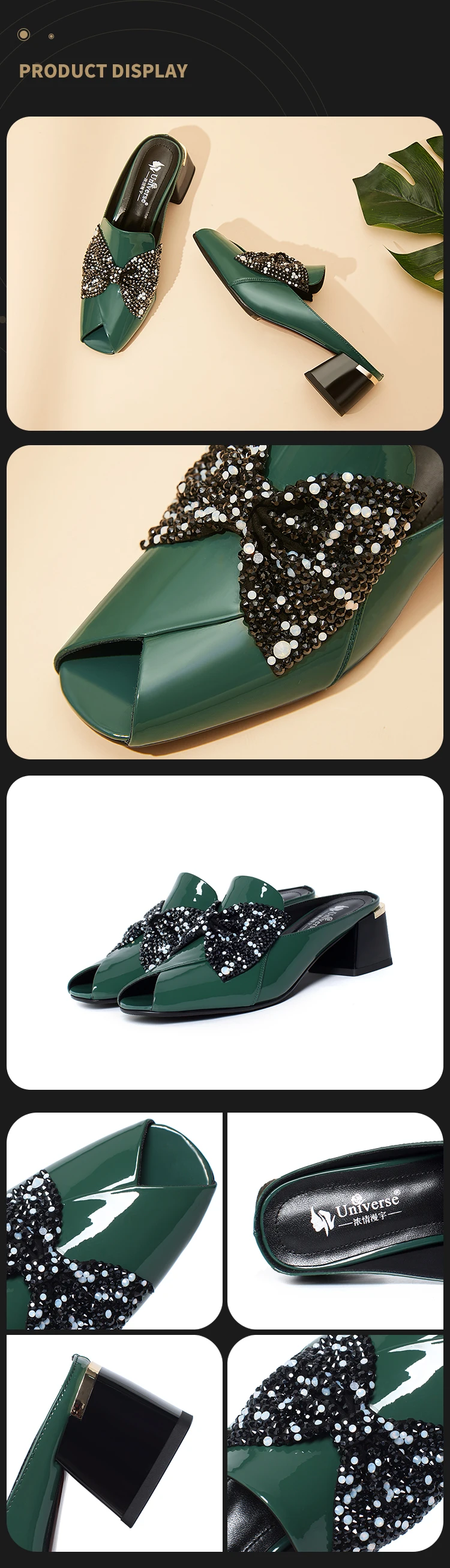 Item name | Universe M161 Latest Design Top Fashion Green Glitter Butterfly-Knot Peep Toe High Quality Manufacturer Leather Slippers Mules | Color | Green/Customized |