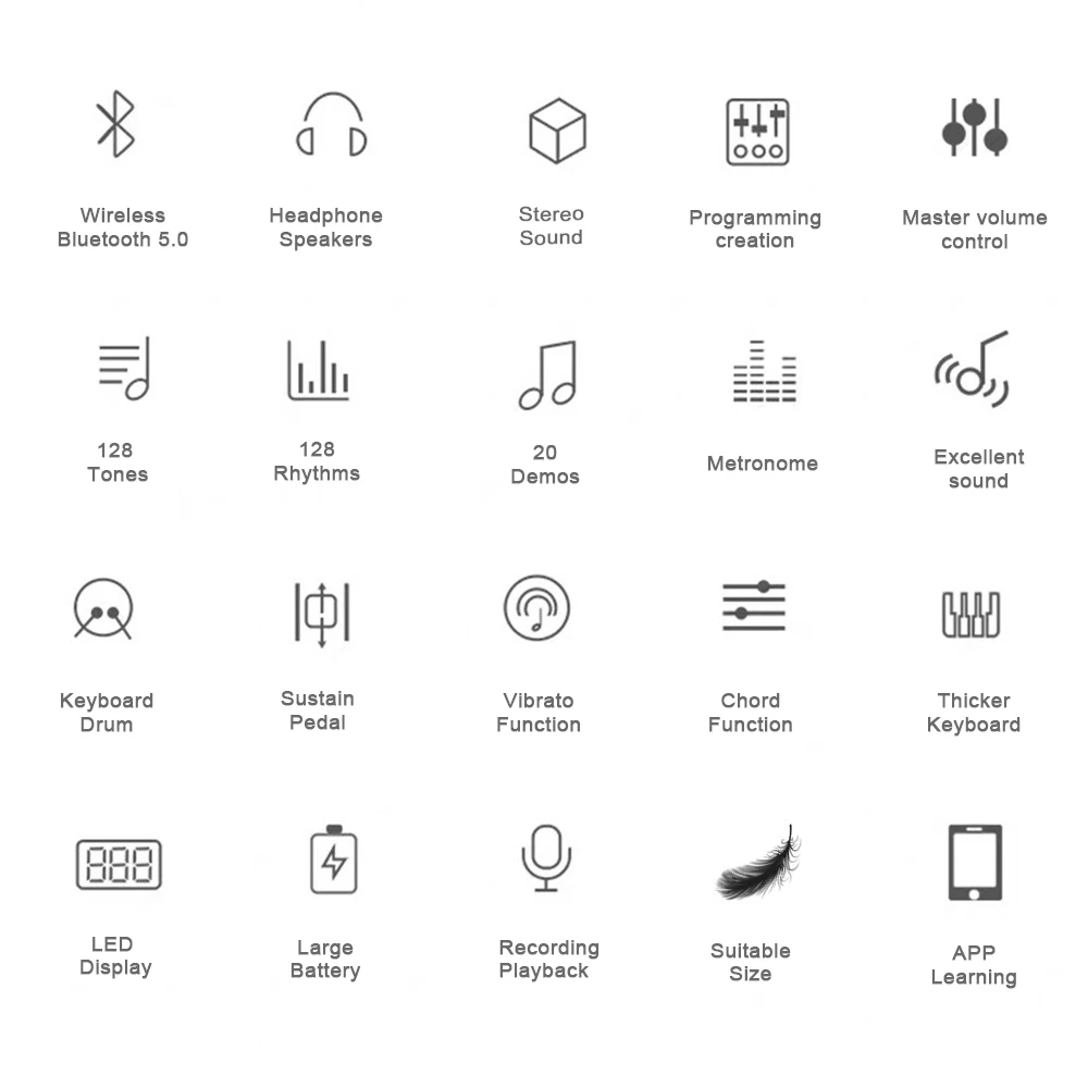 Function | Master volume control keys, Speed control keys, Recording, programmed, playback, Sustain pedal, teaching, drum kit, metronome, transpose, vibrato functions. |